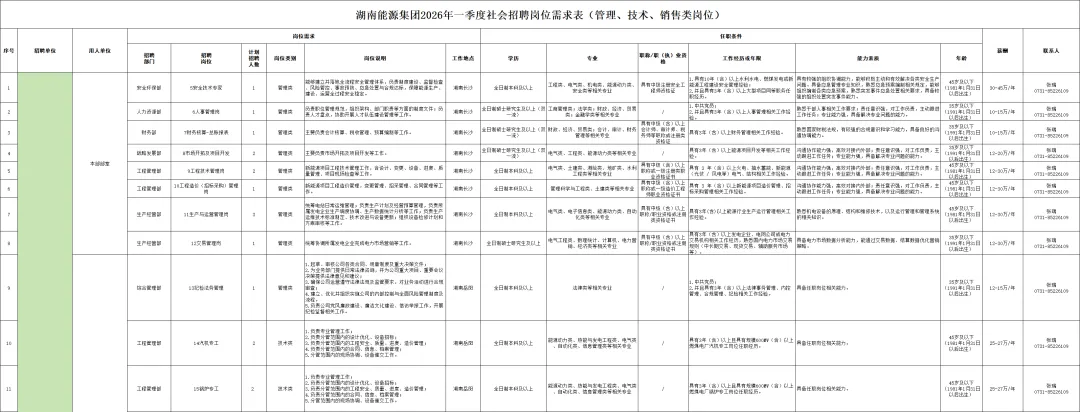 相关子企业联系方式详见附件2《湖南能源集团2026年一季度社会招聘岗位需求表》