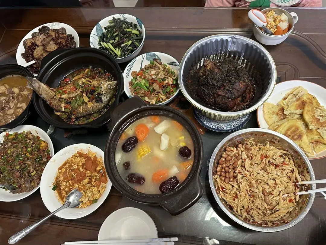 今天,我们一行6人在杏阿姨家吃中饭,先来一张图展示一下杏阿姨的好手艺,我最爱的是那碗酸辣鸡杂,炫了两碗饭🍚。