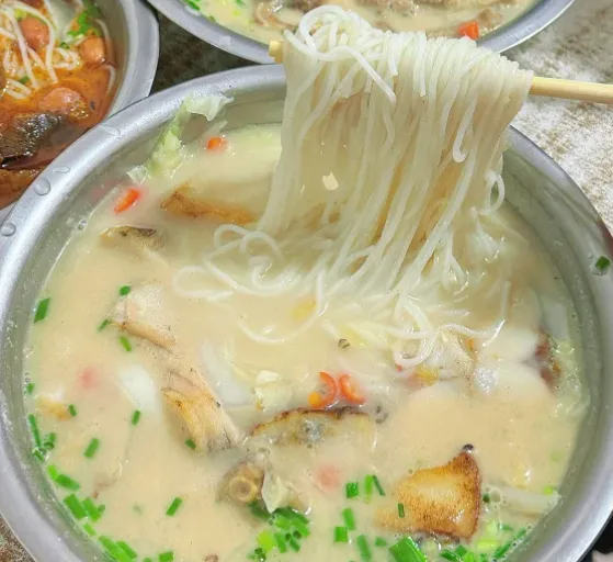 特色推荐:衡阳鱼粉这道菜的灵魂在汤。做法讲究个"鲜"字:先把活鱼现杀,鱼骨和鱼头下油锅煎至两面金黄,再倒入滚水猛火熬煮,直到汤色奶白浓稠。米粉烫好入碗,浇上这滚烫的鱼汤,再铺上煨好的鱼肉片,撒一把葱花紫苏。吃的时候,先喝汤,再嗦粉,最后吃肉,一滴都不舍得剩。