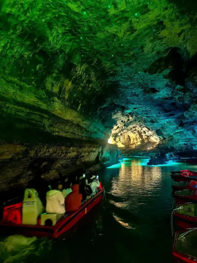 黄龙洞和宝峰湖一静一动,洞里钟乳一年一寸,湖上微风一叶轻。