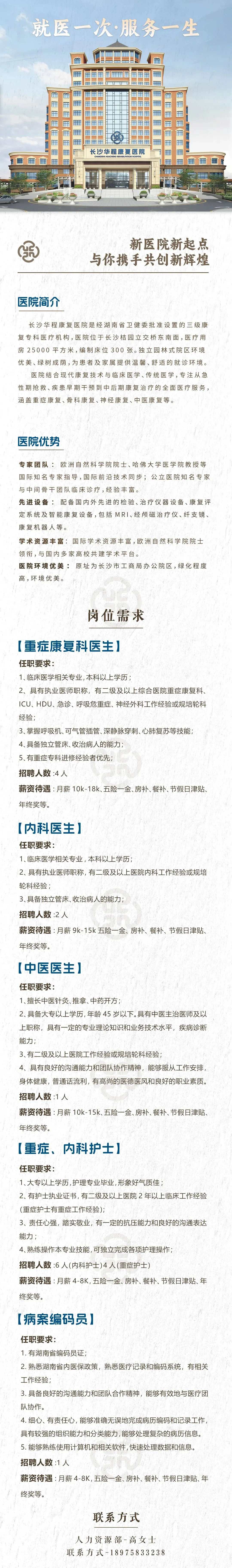 【湖南长沙】大专起报,含护士10名 | 长沙华程康复医院,招聘公告(招满即止)