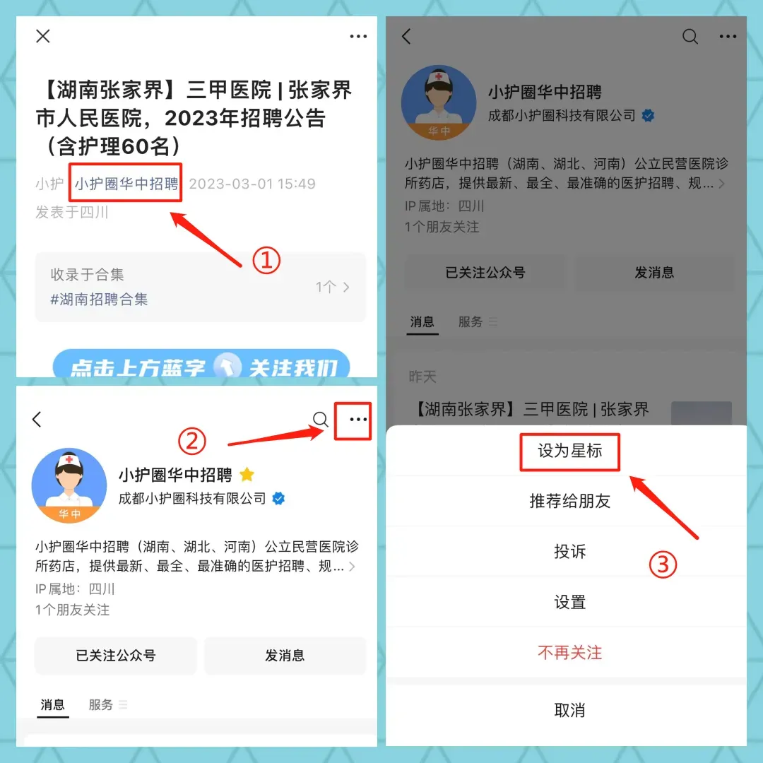 更多精准地区招聘信息,关注小护帮手,订阅城市。实时在线更新!由于微信公众号改版,很多读者朋友反映,最近在订阅号列表里找不到我们了。为了防止和我们走散请给公众号“小护圈华中招聘”设个星标吧!不错过每天的招聘信息。