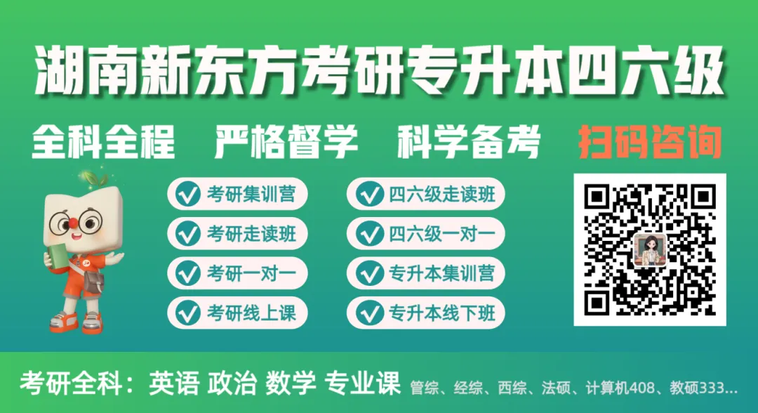 天马校区长沙市岳麓区阜埠河路137号未名电脑城3楼林科大校区长沙市天心区韶山南路498号崇德楼3层长理校区长沙市天心区长沙理工大学东门斜对面(格兰登酒店楼上三楼)涉外校区长沙市岳麓区麓云路138号麓云酒店6楼大汉集训营校区长沙市望城区月亮岛西路月亮河畔西侧约220米长沙新东方考研官方联系电话19974857307(微信同号)湖南新东方考研/考研集训营校区参观预约/考研培训咨询请扫码新东方考研规划李老师