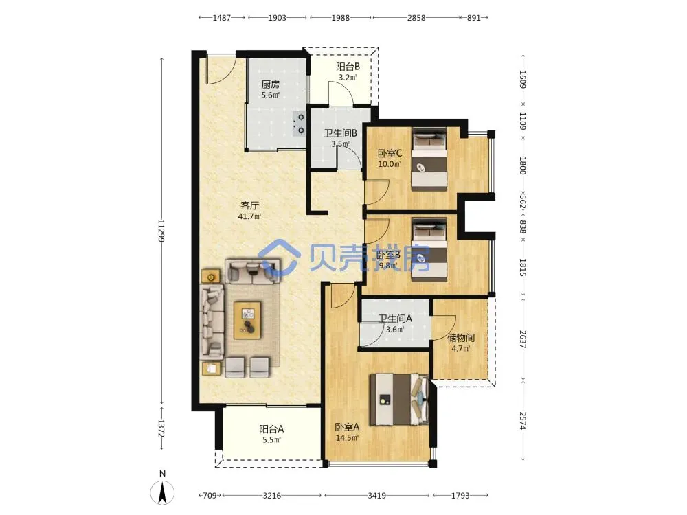 近130㎡,总价189万,大三房布局,明厨明卫,不看江,带精装,配备了中央空调+地暖。