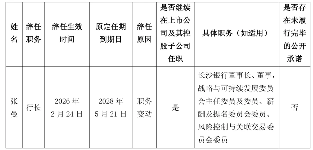 2月25日盘后,长沙银行发布公告称,张曼因职务变动申请辞去长沙银行行长职务,辞任自2026年2月24日起生效。