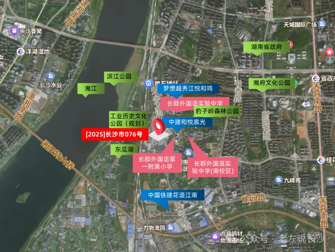 该项目即去年12月润和城摘得的[2025]长沙市076号住宅地块,两个地块中间被天心大道隔开,在中建和悦宸光对面,成交楼面价约5080元/㎡。