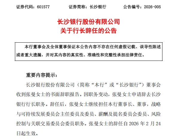 长沙银行将聘新行长!2026年2月25日晚,长沙银行发布公告称,董事会收到张曼的书面辞职报告,因职务变动,张曼申请辞去长沙银行行长职务。张曼的辞任自2026年2月24日起生效。
