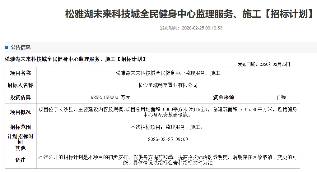 2026年2月25日,长沙官方发布公告,松雅湖未来科技城全民健身中心监理服务、施工即将招标。