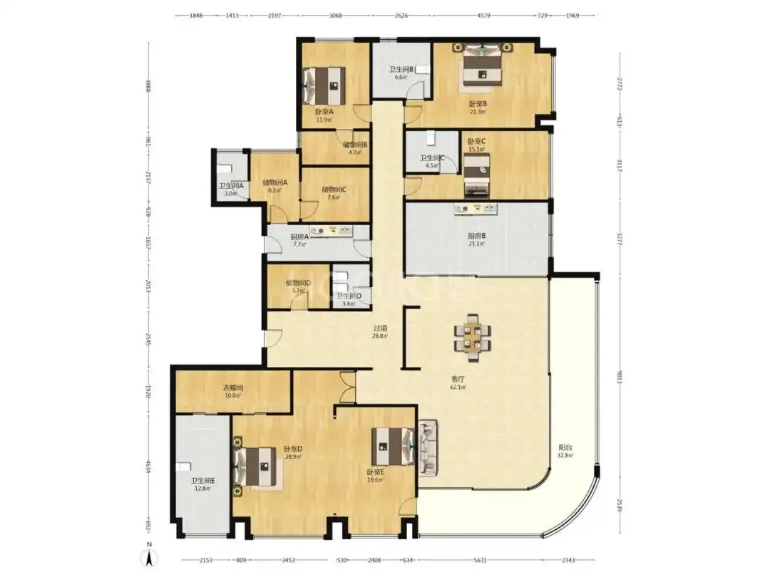5房2厅5卫,带开发商交付的豪装,全一线品牌:五恒系统/大金空调、霍尼韦尔新风、全屋智能家具、全屋净水、杜拉维特洁具、博世厨电等。