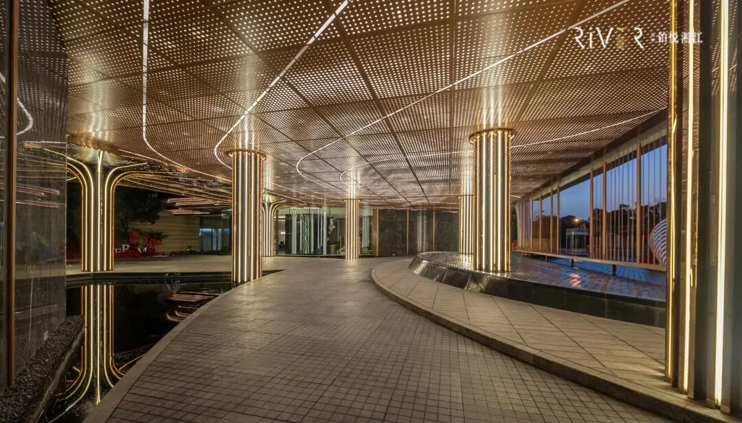 内部配备3000㎡劳斯莱斯会所、奢华环岛落客、恒温泳池、健身房、200吨巨型柱体水族馆、7.5万方园林,每个单元的主入口都采用了全铝板装饰,将豪宅的气场和尊贵拉满。
