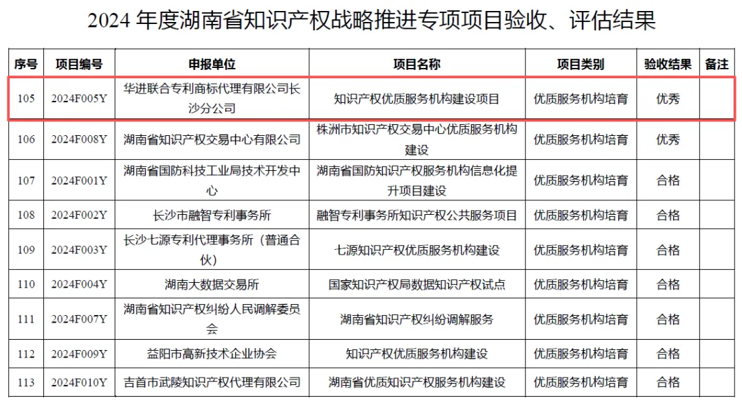 近日,湖南省市场监督管理局公布了2024年度湖南省知识产权战略推进专项项目验收评估结果,华进联合专利商标代理有限公司长沙分公司(下称“华进长沙公司”)承担的“知识产权优质服务机构建设项目”获评优秀等级,也是同批次9个优秀服务机构培育类项目中,唯二获评优秀的项目。
