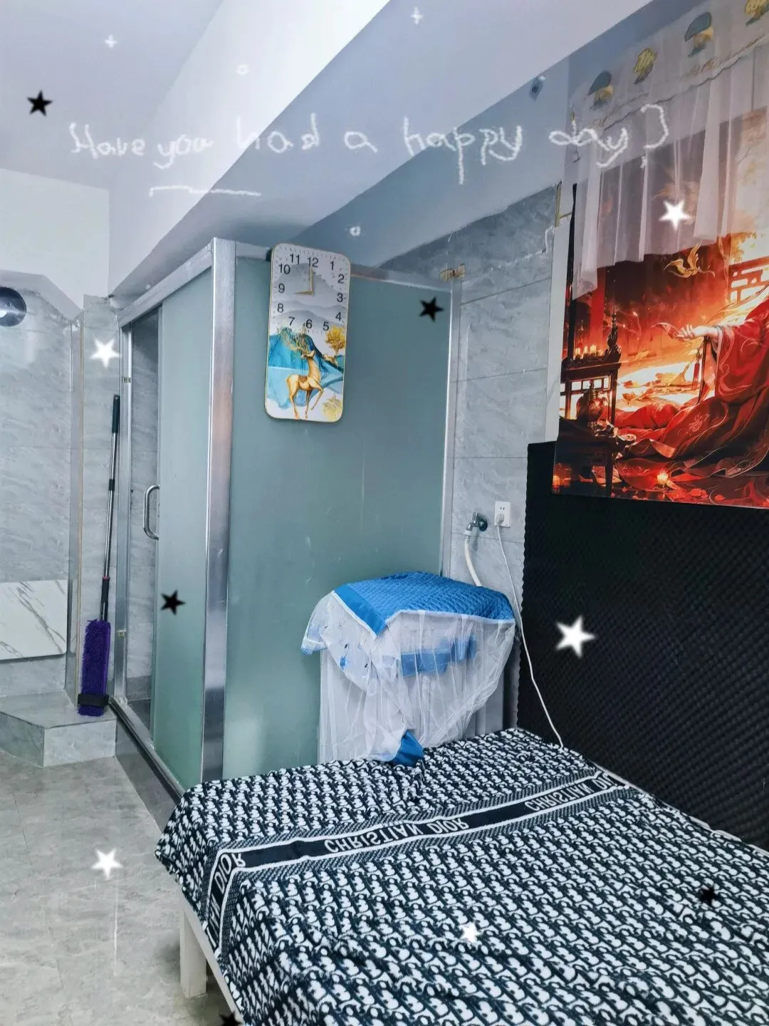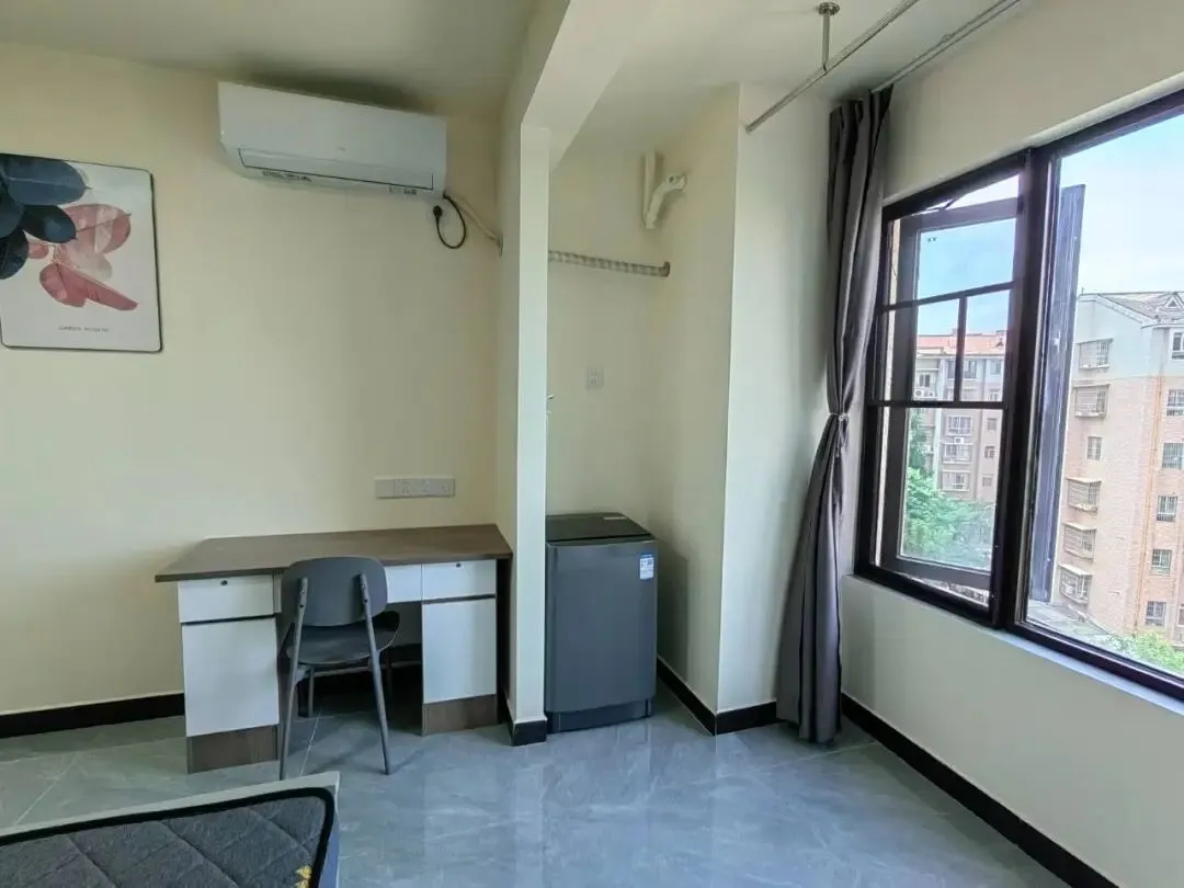 房间很大,房间有独立空调,独立阳台,独立衣柜,独立电表,独立桌椅,独立1.5米实木床。共用两个卫生间都大,一个小厅,两台新洗衣机,民用水电气,物业都很便宜。