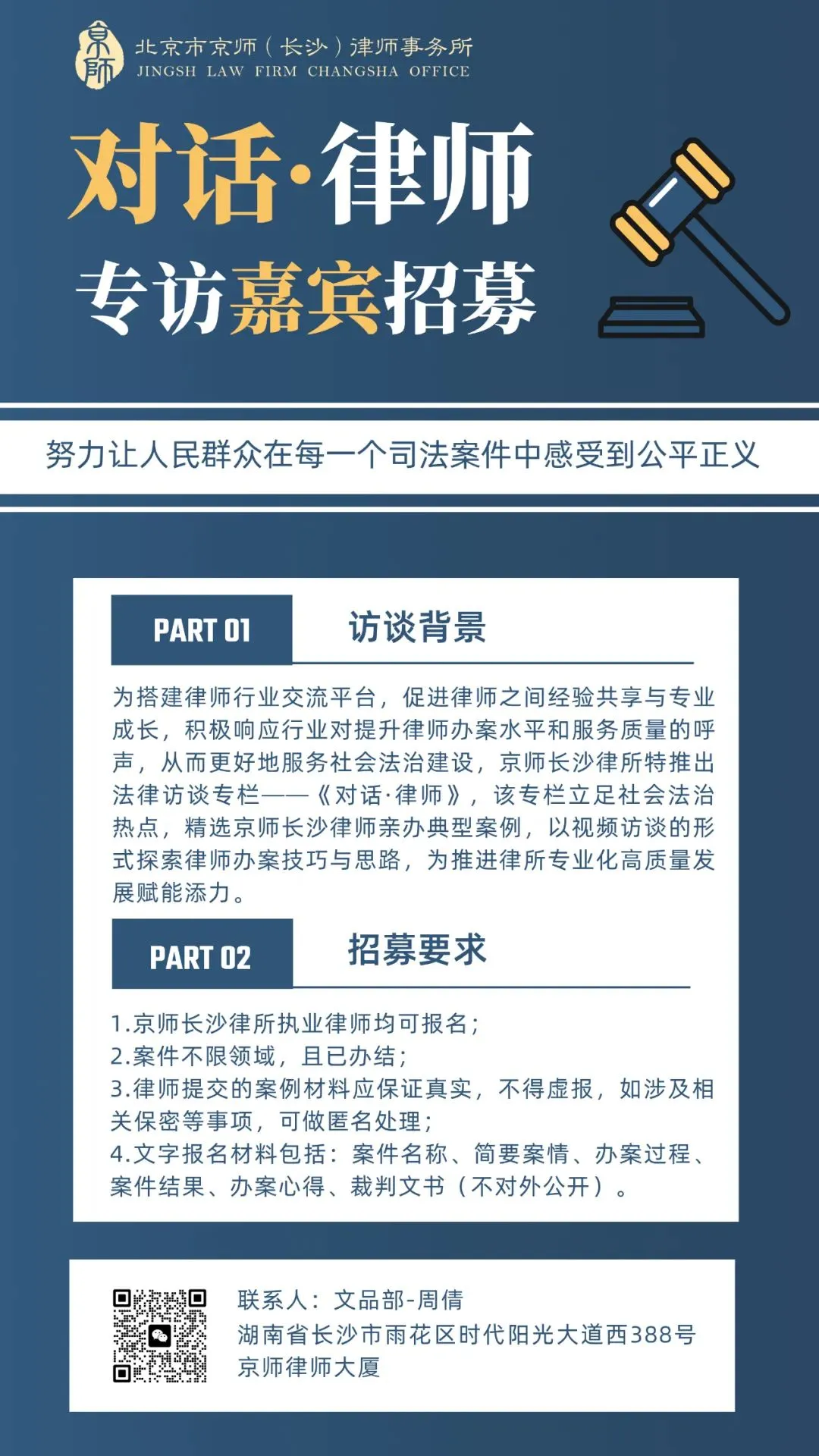 为搭建律师行业交流平台,促进律师之间经验共享与专业成长,积极响应行业对提升律师办案水平和服务质量的呼声,从而更好地服务社会法治建设,京师长沙律所特推出法律访谈专栏——《对话·律师》,该专栏立足社会法治热点,精选京师长沙律师亲办典型案例,以视频访谈的形式探索律师办案技巧与思路,为推进律所专业化高质量发展赋能添力。1.京师长沙律所执业律师均可报名;