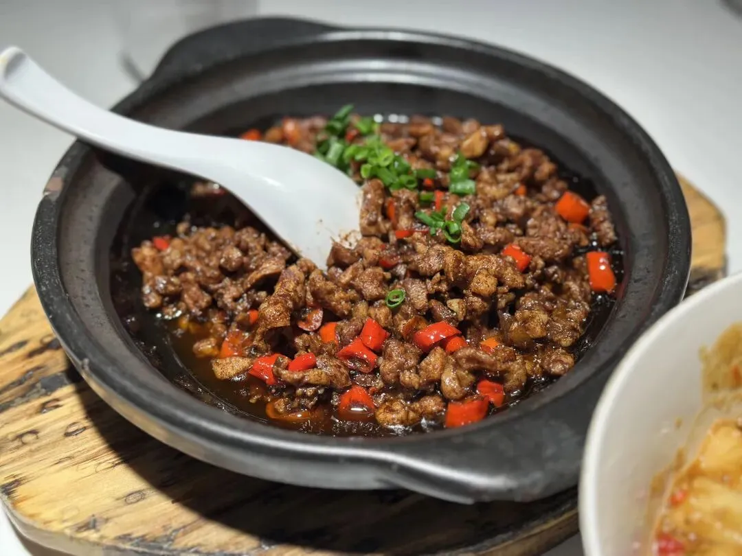 三人落座,按着服务员的建议点了四个菜:攸县血鸭、川椒海鲈鱼、芋头萝卜菜,还有一碗开心米豆腐。攸县血鸭端上来时还冒着热气,鸭肉去骨切得细碎,和小米辣一起炒得油亮亮的,夹一筷子拌进饭里,咸香辣味全渗进米粒中,真正是“下饭的神器”。三十来块钱,实打实的一满碗。