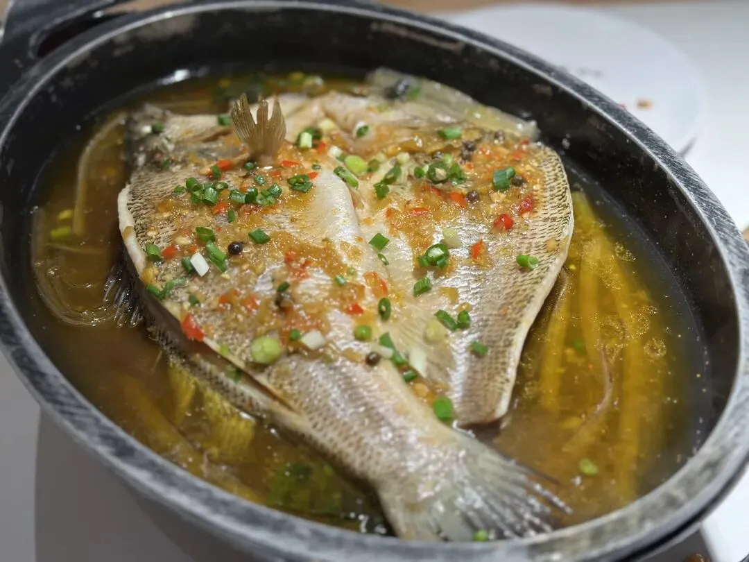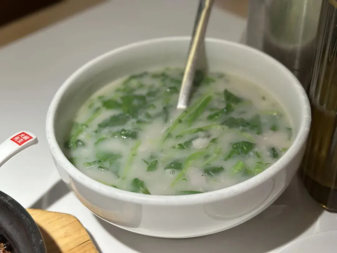 川椒海鲈鱼更让人惊喜。四十二元的价格,鱼肉鲜嫩不说,锅底还铺着一层粉皮。汤汁是整道菜的灵魂,服务员见我们拿粉皮拌饭,笑着提醒:“这汤拌饭才叫绝。”一试果然,辣中带鲜,鲜里透香,三个人就着这碗鱼又添了一轮饭。