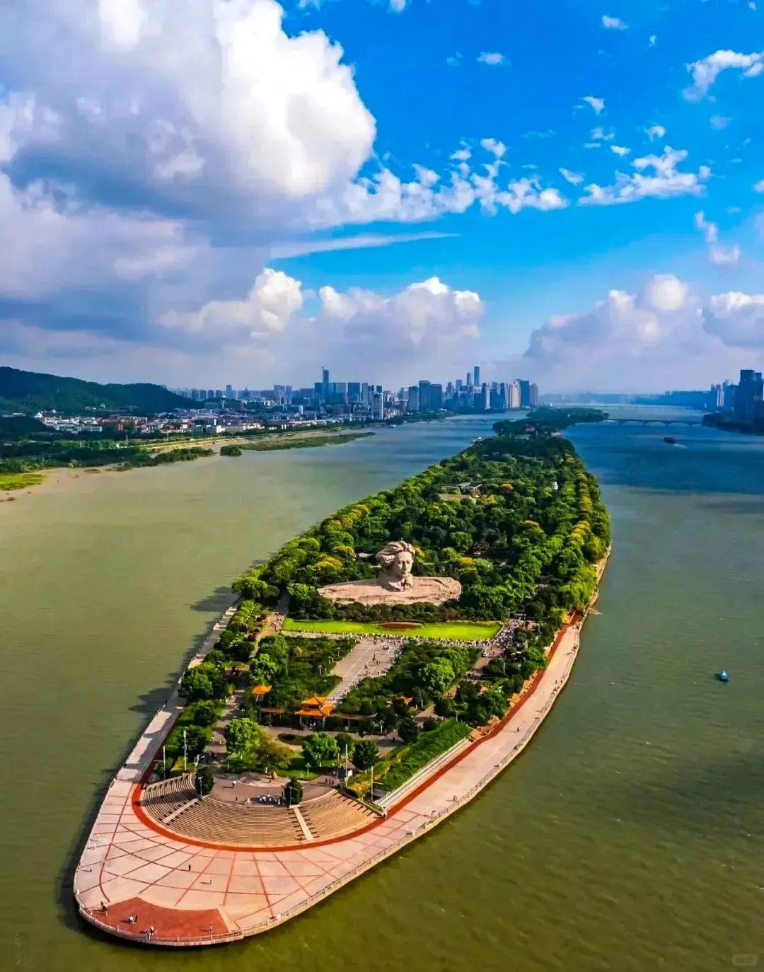 32米高的青年毛泽东雕像巍然矗立,与《沁园春·长沙》石碑遥相呼应,定格着“指点江山,激扬文字”的豪情。洲上柑橘林四季常青,春日江鸥盘旋,秋日金橘飘香,冬日“江天暮雪”如画,20元观光车可环岛漫游,洲尾柑橘文化园的光影与绿植交织,随手一拍便是诗意大片。