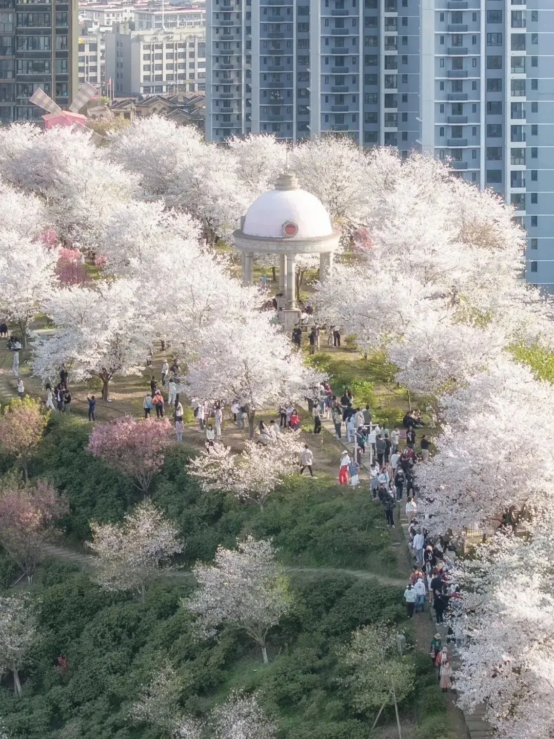 作为中南地区的赏樱天花板,园内有150亩染井吉野樱,还有华中樱、钟花樱等点缀,共3000余株樱花。