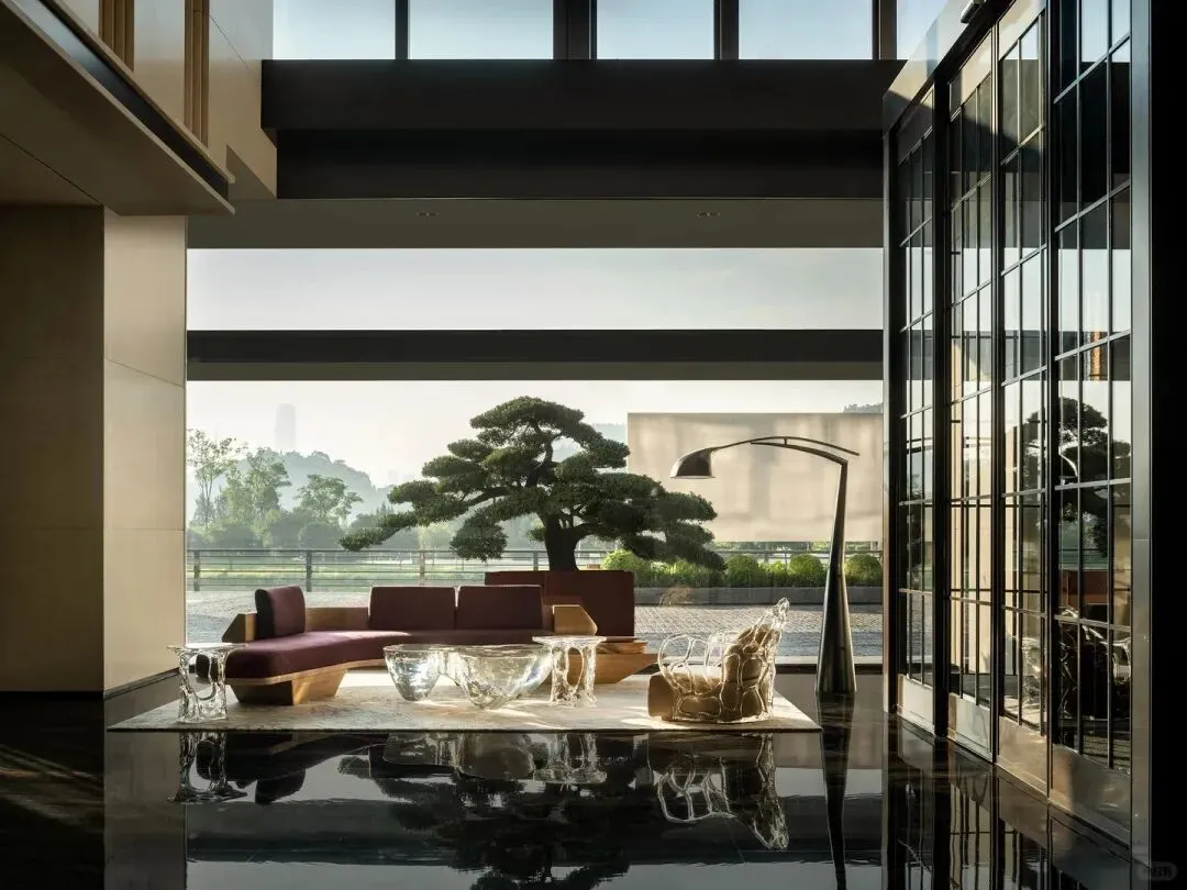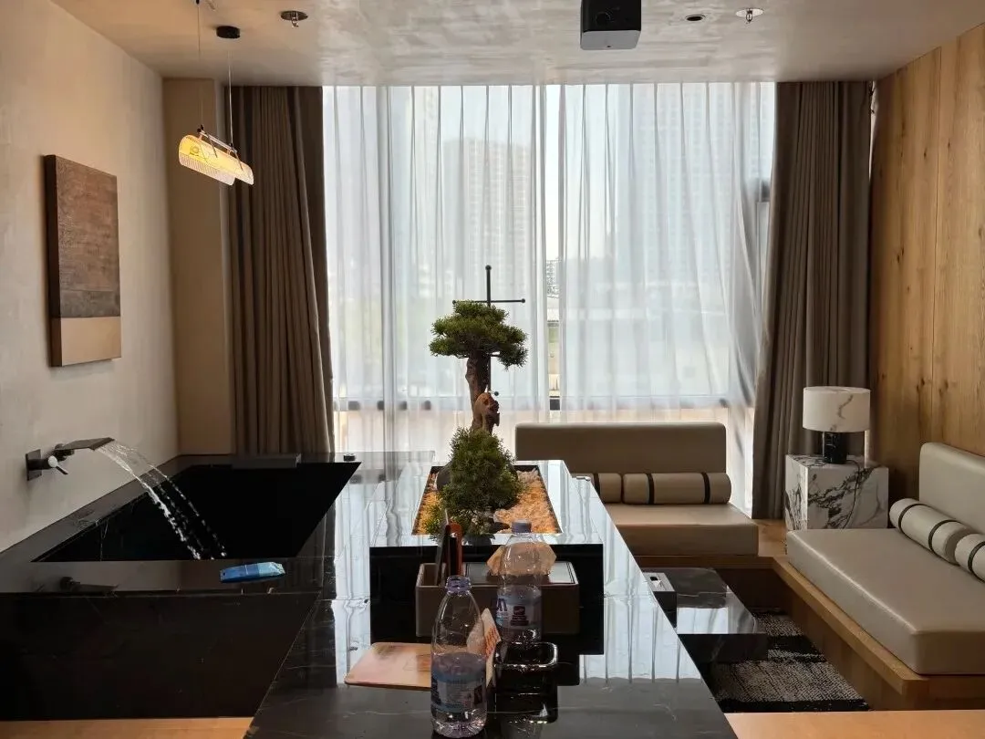 整体设计以“五行四季”为主题,公共区域大量运用木、石、水等自然材质,搭配美术馆式艺术装置,巨型落地窗外是岳麓山的苍翠林海,室内点缀着湘绣非遗摆件,静谧中透着雅致。283间客房均配全景落地窗,山景房可赏层林叠翠,江景房能览湘江奔流,高品质床品、55寸高清电视与恒温卫浴,在细节处驱散旅途疲惫。