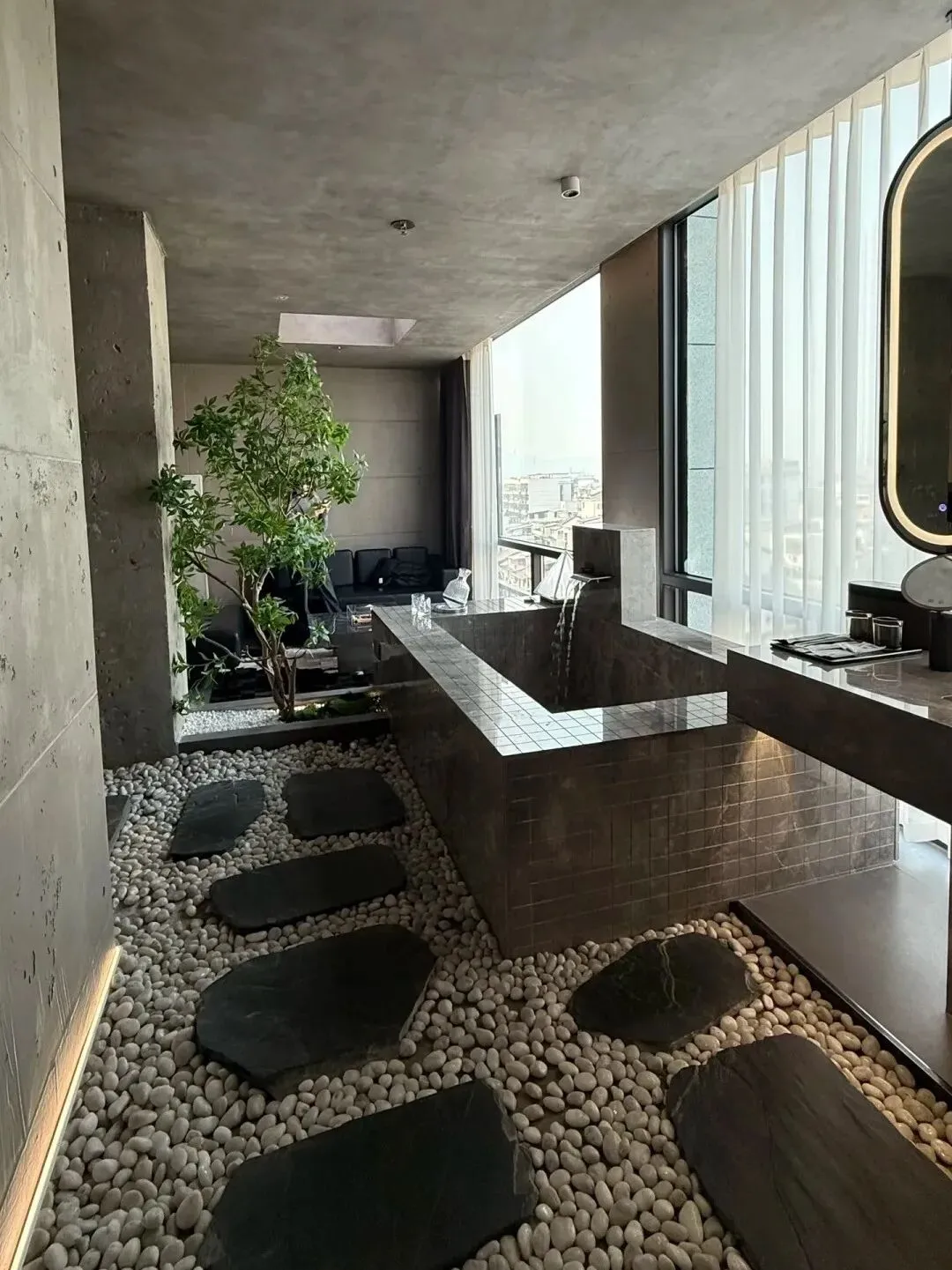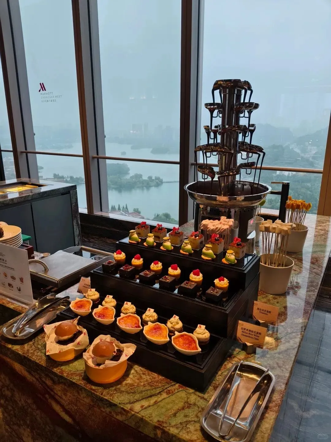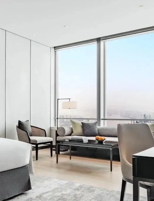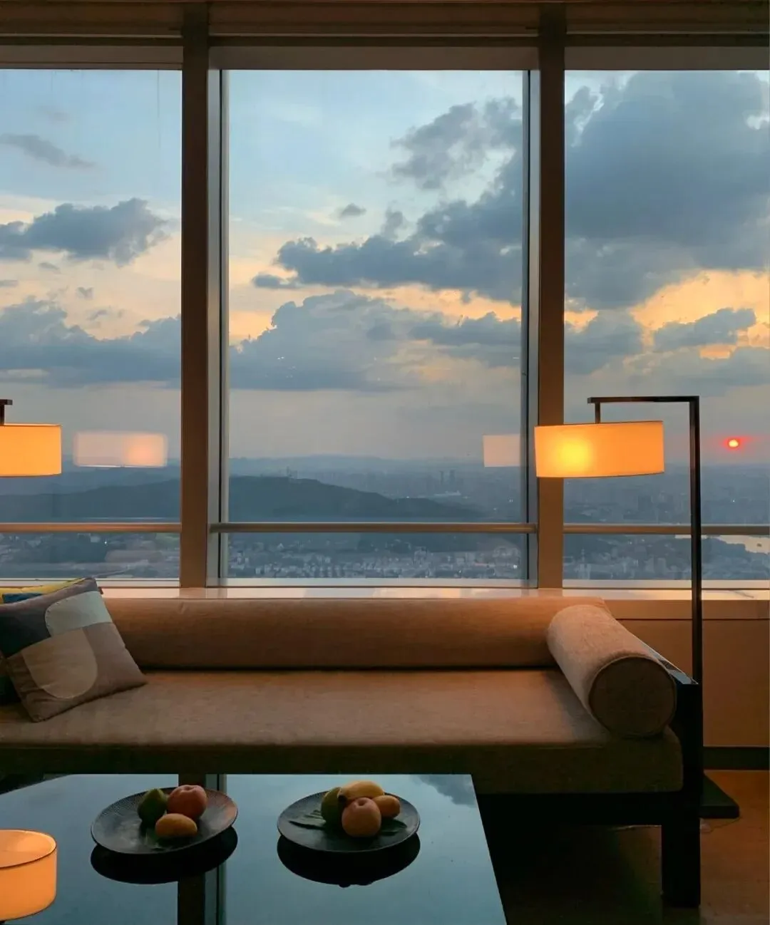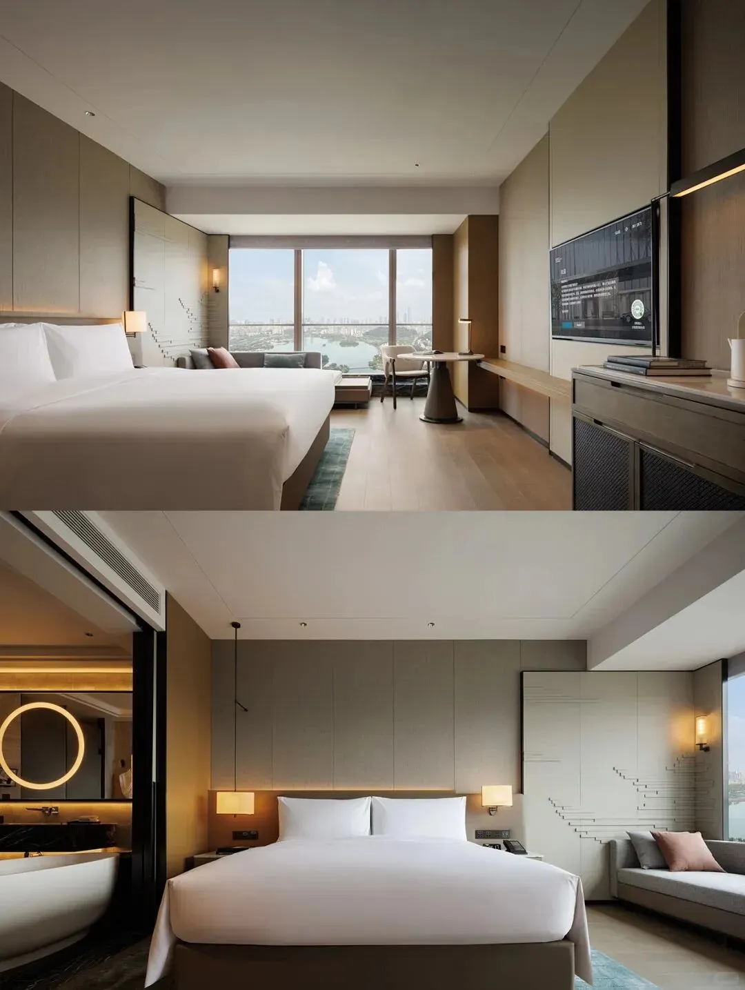 大堂以“探索城市天际线”为灵感,悬浮式艺术装置与巨型落地窗相映,93层的“悦廊”可360°俯瞰橘子洲与湘江风光;客房采用极简现代风格,全景落地窗将城市霓虹尽收眼底,配备智能马桶、戴森吹风机与定制香氛洗护,细节处彰显奢华。