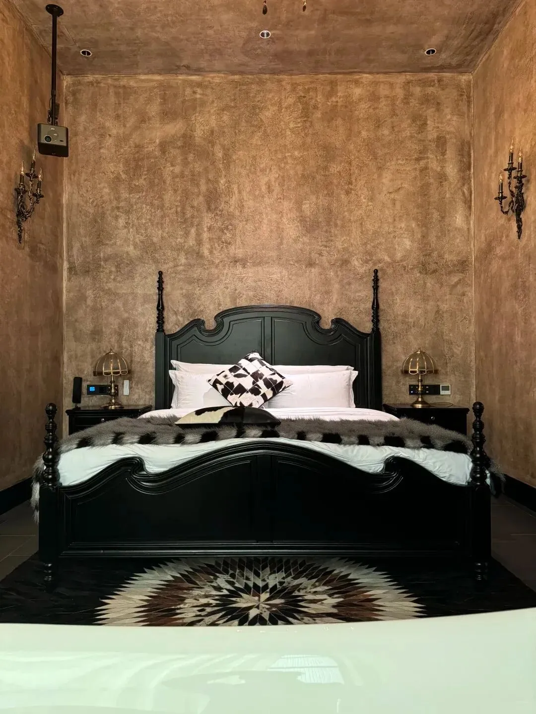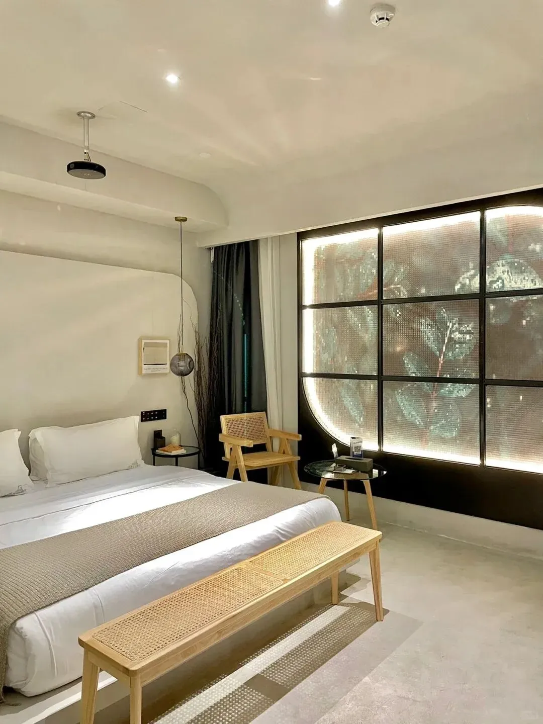 设计以“复古南洋风”为基调,大堂陈列着老长沙旧物与本土艺术家画作,客房以原木与棉麻为材质,配备乳胶床垫与智能投影,部分房型带独立庭院,可在藤椅上喝着茶颜悦色,静享老巷时光。