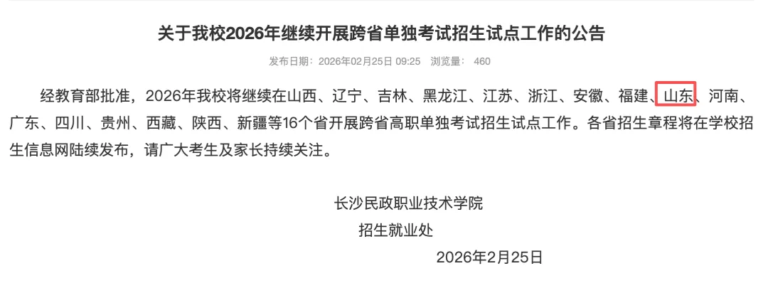 >长沙民政职业技术学院|2026年继续开展山东省跨省单独招生考试