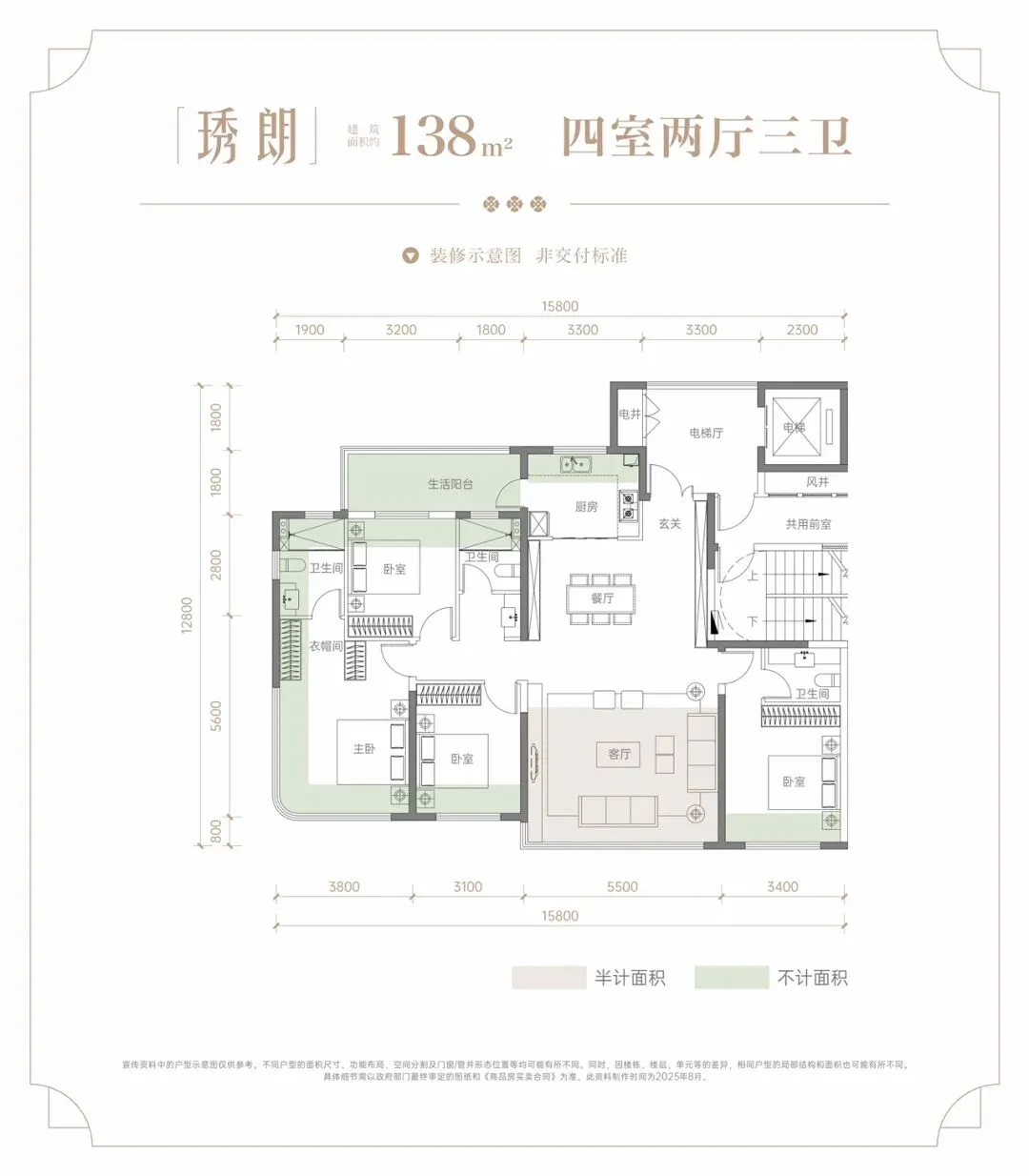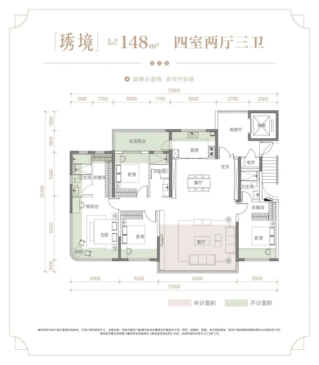 新规前报建,得房率110%-120%,128㎡≈140㎡套内,143㎡四房三卫全明,170㎡五房三卫+私梯入户