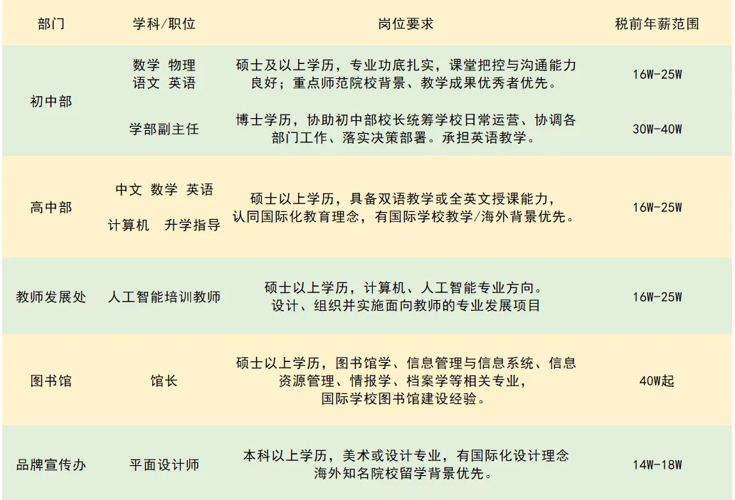 薪酬竞争力强劲:教学岗年薪12-45万,优秀人才薪酬可面议,教学管理岗薪资另行商议;