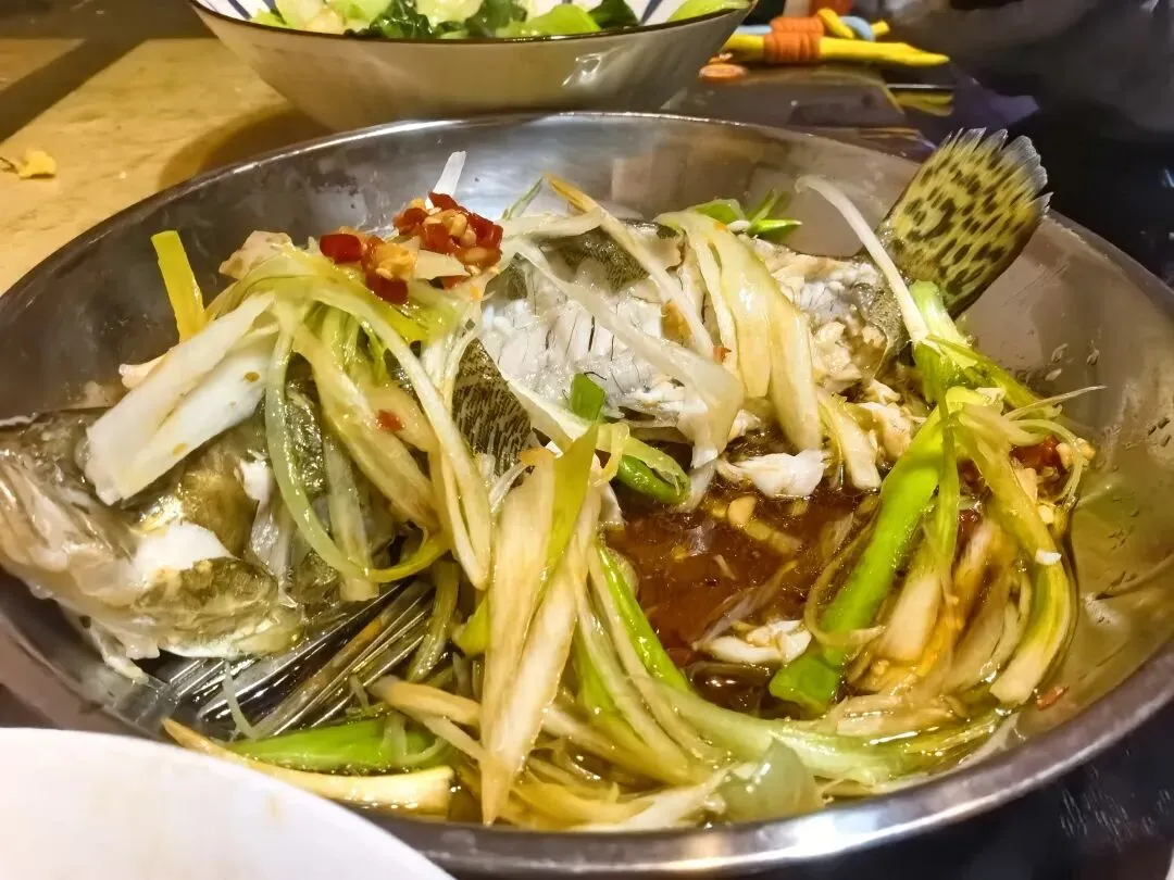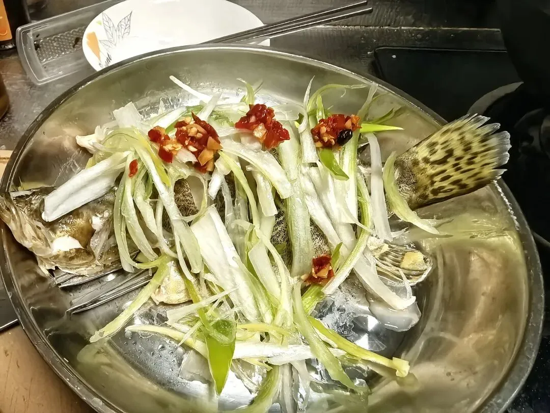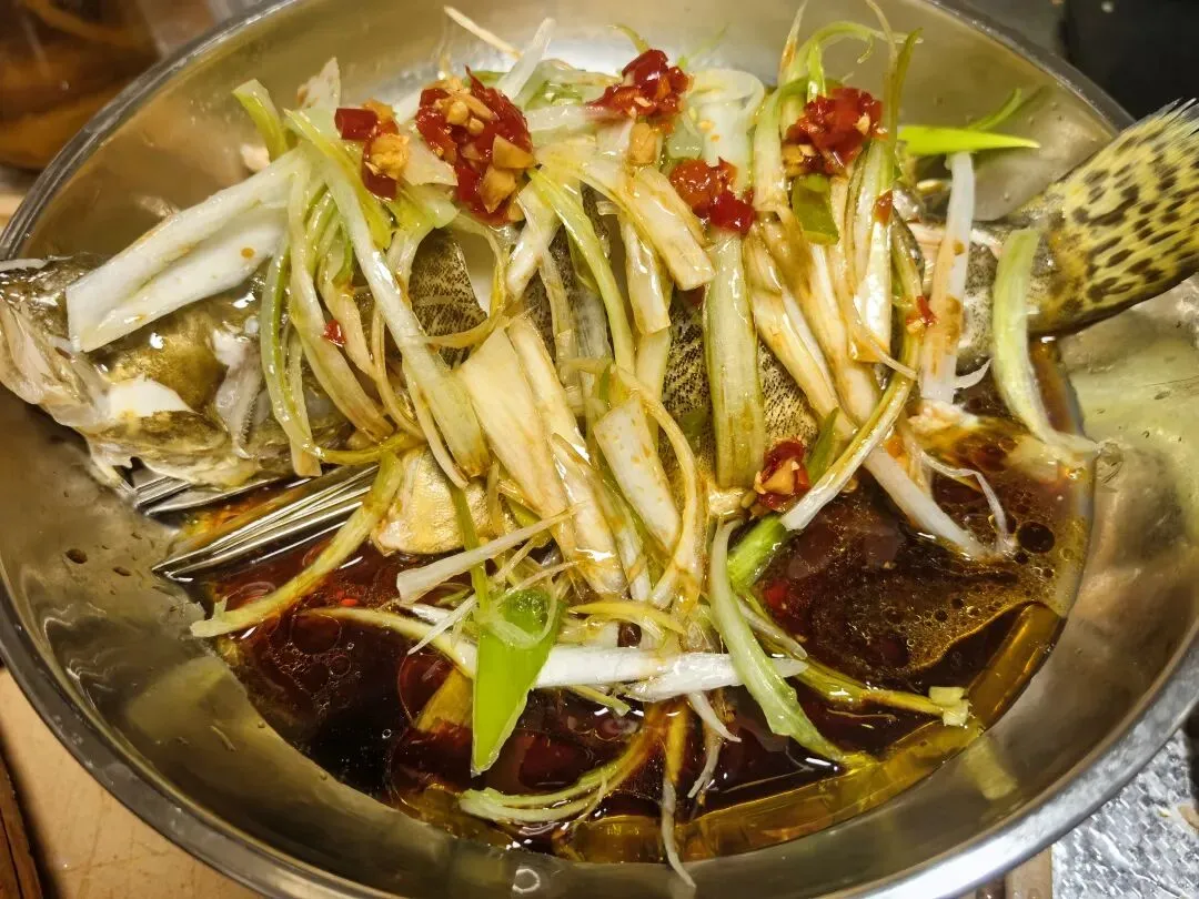 最后,把提前切好的大葱丝、姜丝铺在鱼身上,喜欢吃辣的长沙满哥跟妹坨,还可以再加点剁辣椒,颜色也好看。再烧一小碟滚油,“滋啦”一声淋在葱丝姜丝上,那香味一下就冲出来了,整个厨房都是香的嘞。