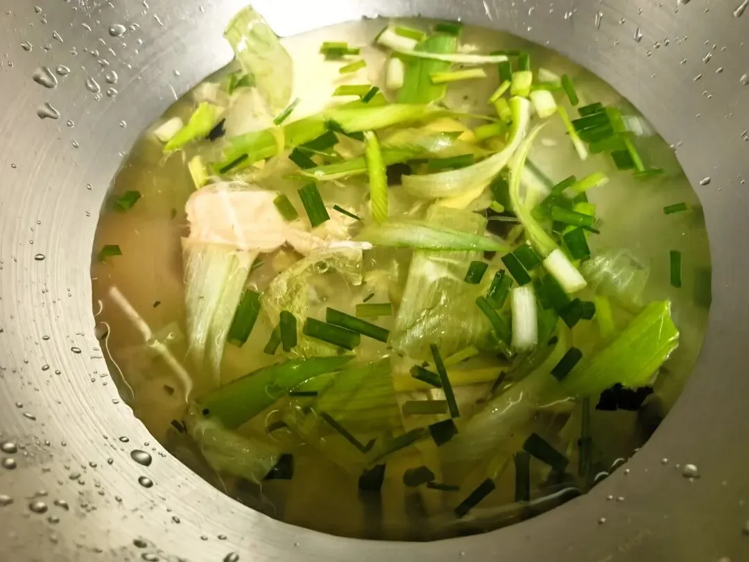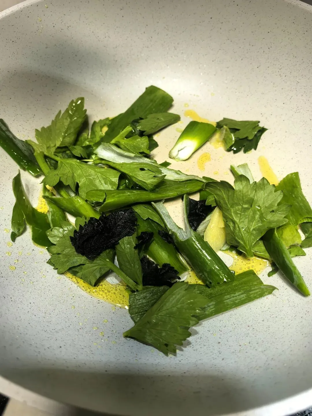 趁到腌鱼的功夫,我们来搞个葱油。把腌鱼用剩的葱姜、芹菜、紫苏只要是增香的配菜可以都丢到锅里,倒点油,小火慢慢煎,煎到葱姜都变得金黄焦香,这个葱油就熬好了,倒出来留到后面用,这是提香的关键。