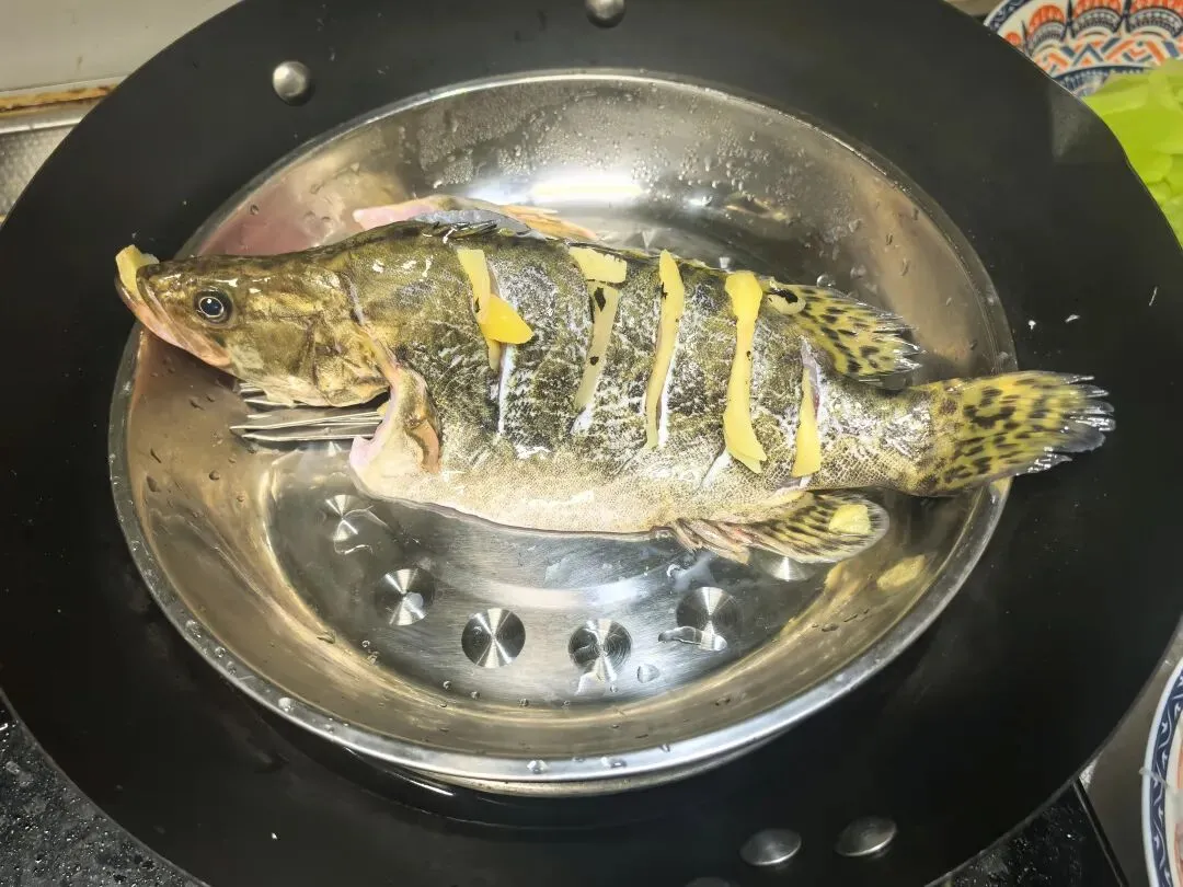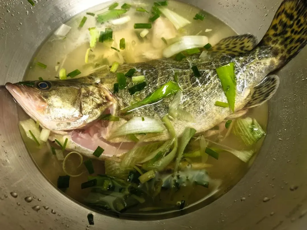 然后大火蒸8分钟,时间一定要掐准,蒸久了肉就老了。鱼蒸好端出来,先把盘子里那股腥水倒掉,姜片也夹走,这水千万不能留,不然鱼吃起来就腥。