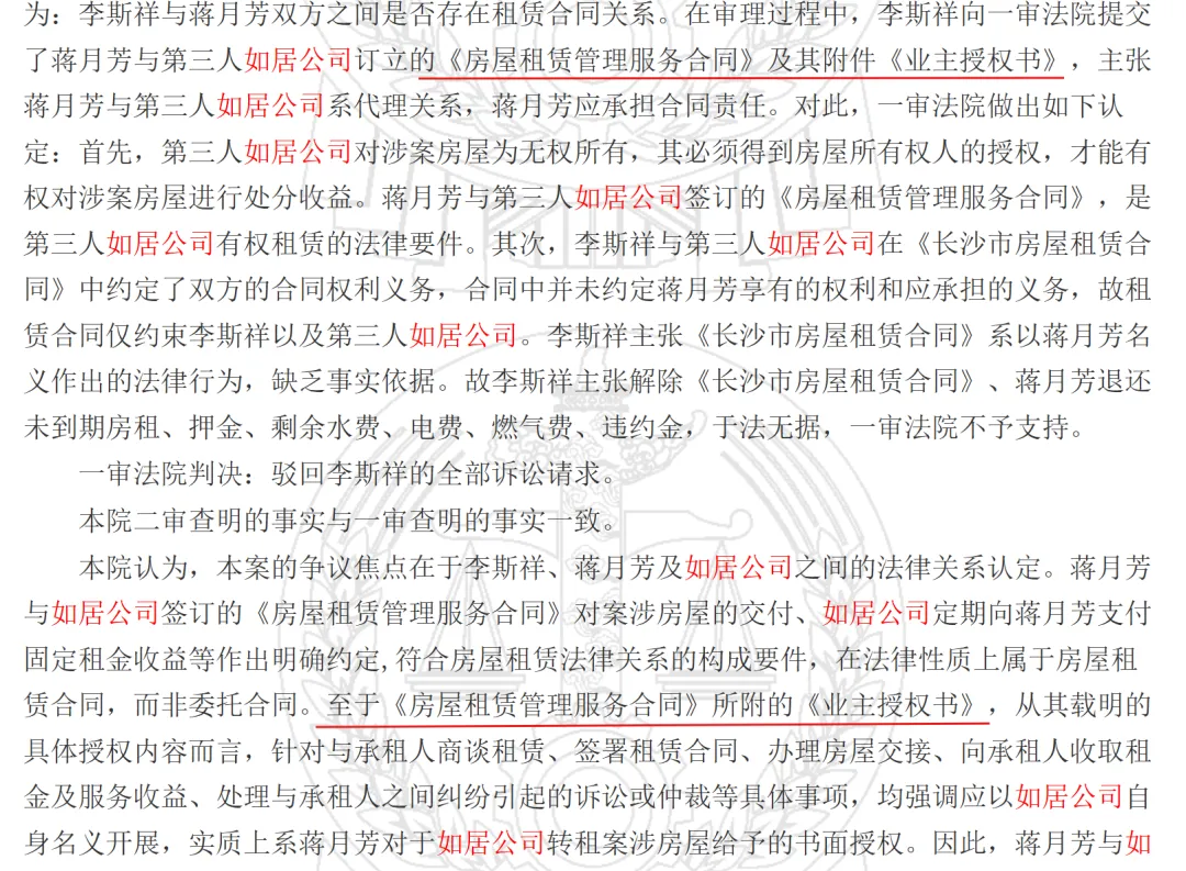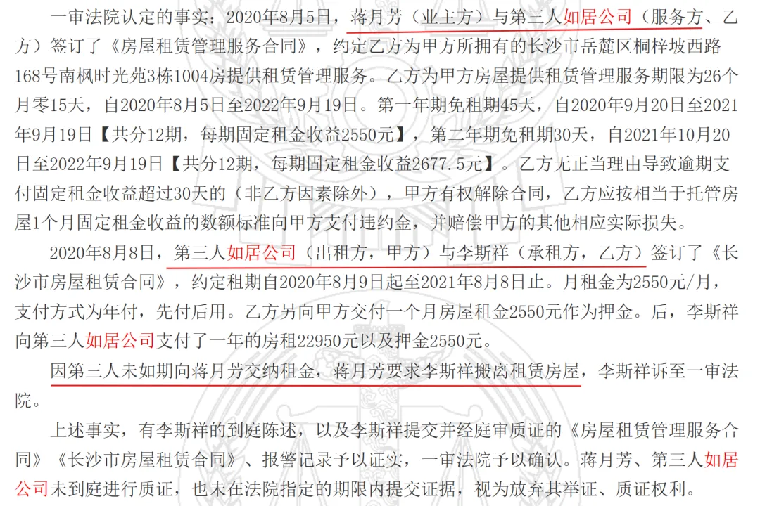 (2021)湘01民终13803号涉案公司为长沙如居房屋租赁有限公司,与公开举报湖南长沙中院张訸、蔡晓、程婧等十名法官枉法裁判误导舆论我提到的四份二审判决中的涉案公司长沙易居名舍科技有限责任公司的所作所为几乎如出一辙,我就直接引用(2021)湘01民终13803号判决书中的描述吧: