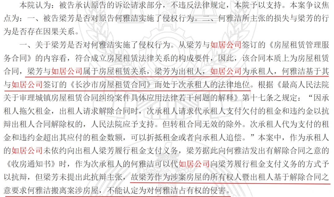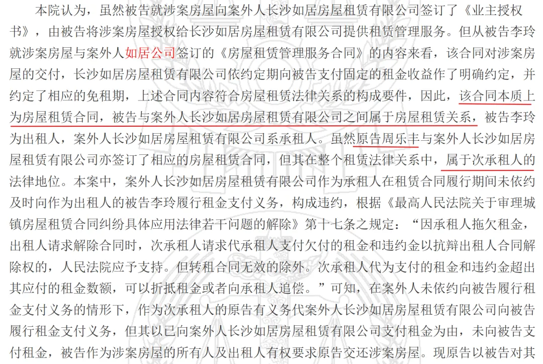 注意,(2021)湘01民终13803号维持的一审湖南省长沙市岳麓区人民法院(2021)湘0104民初1722号无法在裁判文书网检索到。事实是,岳麓区法院对同一家如居公司出具过多份一审判决,可以查询到的有(2020)湘0104民初15746号《周乐丰与李玲房屋租赁合同纠纷一审民事判决书》、(2021)湘0104民初2453号《何雅洁、梁芳占有排除妨害纠纷民事一审民事判决书》。以上三个岳麓区法院一审、一个长沙中院二审裁判结果都是完全一致,即认定如居公司为承租人、租客为次承租人,租客手持与公司合同不能约束房东,最终判决支持房东!
