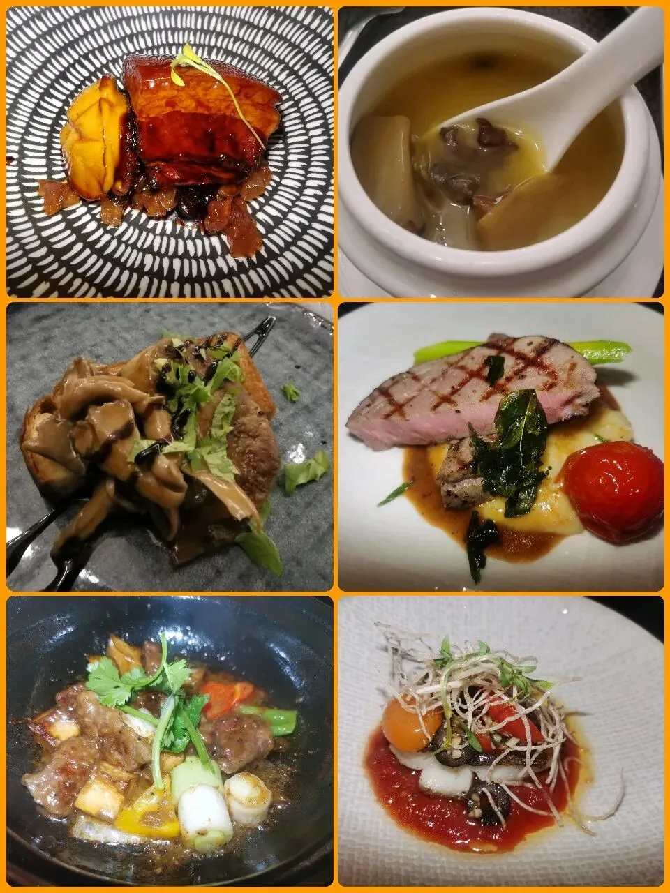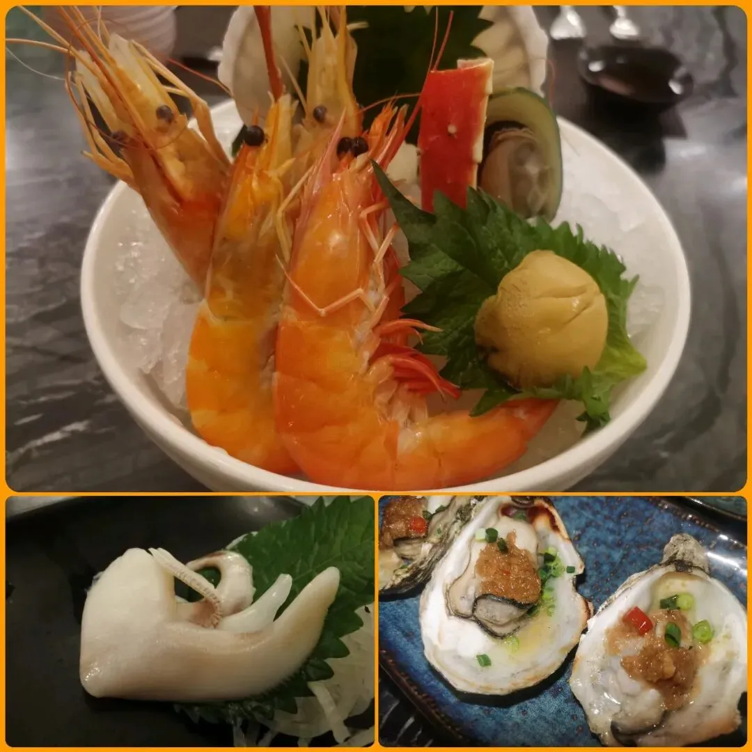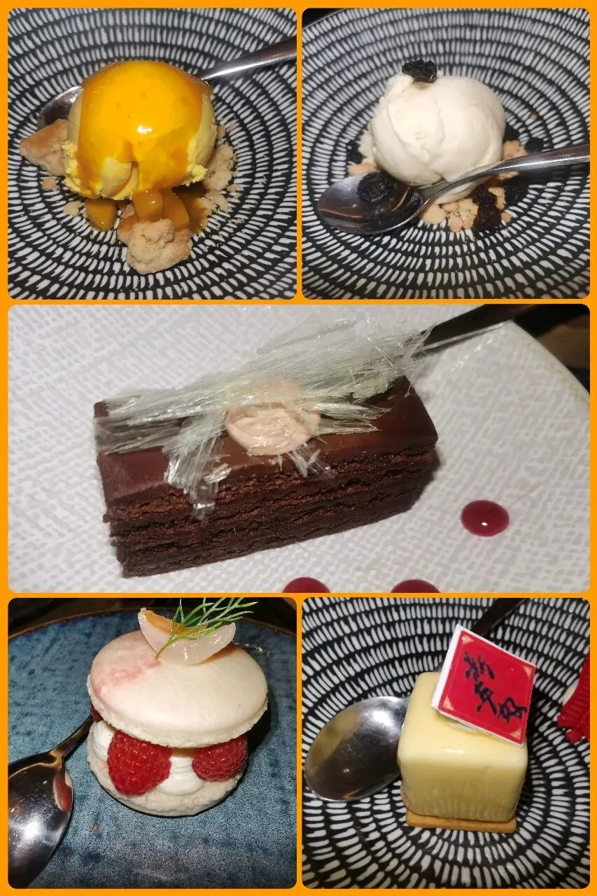 海鲜拼盘,有虾、鲍鱼、青口,虾有罗氏虾和大明虾,都比较新鲜。刺身点了个鸟贝,口感还可以。由于最近不太想吃生冷的,所以没点更多刺身,喜欢刺身的还是可以点更多。鲍鱼红烧肉口感很好,但有甜味,小朋友非常喜欢,但我更希望没甜味,哈哈。个人觉得鹅肝好吃,牛肉和香煎比目鱼还行……现烤羊排很好吃,趁热吃,很嫩,外面一层焦脆的口感,羊排蘸着土豆泥和黑椒汁,很不错。他家甜品挺好吃,我们点了芒果冰淇淋、朗姆酒提子冰淇淋、巧克力布朗尼、荔枝马卡龙、栗子奶油蛋糕,都很不错,尤其推荐这个栗子奶油蛋糕,口感和味道都很好。今天唯一觉得不合胃口的就是长沙臭豆腐,口感可以,但是太辣了。晚上我们两个已经吃得很撑了,但是还有很多东西没吃,以后有机会等战斗力强点的时候再去吧,哈哈。