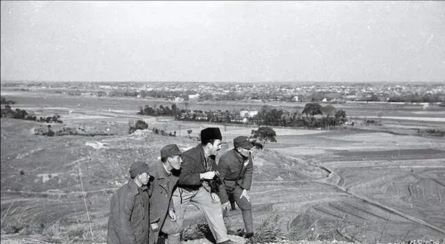 这个姿势叫观察地形,前头一人半蹲,手掌遮住眉骨向远方指去,后头几位排成小弧线,脚下是犁过的田垄,远处城郭像一条灰线压着地平,风阵阵刮过来,呢子军装呼啦啦抖两下,那时候打仗先看路,路看明白了,仗就有八分把握,现在导航一开就到了,过去全靠眼力和脚板。