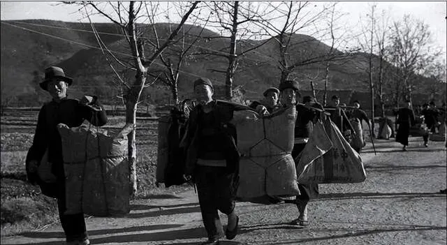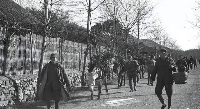 图中这些牲口叫驮驴,背上叉着粗粗的树枝,当掩蔽也当柴火,缰绳拴得贴服,蹄子踩在砂石路上咔嗒咔嗒,领驴的人披着厚大衣,肩上斜挎水壶,走起路来不急不慢,这些看着不起眼的小脚力,能把一线阵地的锅碗、弹药、树枝伪装全给送齐,一驮顶十趟小推车,现在城里车喇叭一按就来,以前全靠驴脊背硬。