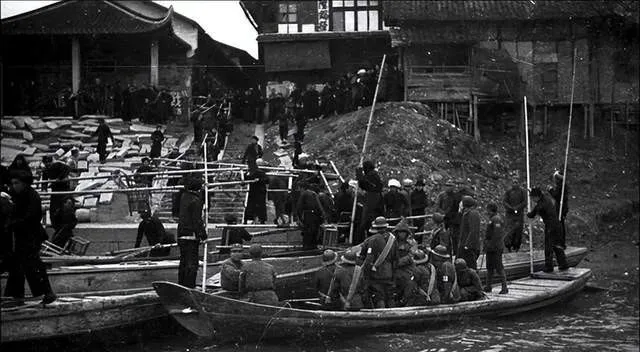 这处码头叫东山镇渡口,木排沿台阶铺开,青瓦檐下挤满人影,船上竹篙横搭成棚,士兵肩上扛着箱子一下一下往下递,掌舵的吆喝一句慢点,再来一条,岸边的小店挂着斑驳的招牌,字迹糊开了还认得出“米”“油”,那时候过河靠臂膀,把篙撑直了,船就不歪。