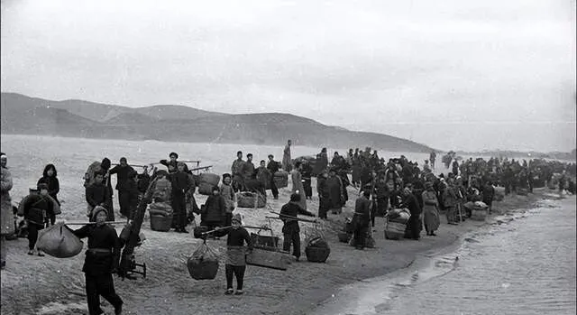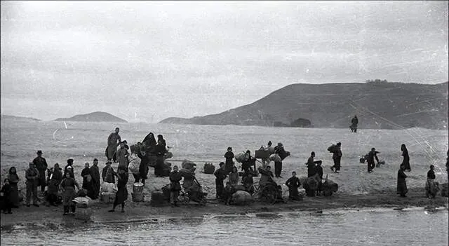 这两张都叫等路,前一张人群排成一条带,挑担的、抱婴的、牵小孩的,脚边一堆一堆包裹,后面那张人站散了些,脸都让风刮得发黑,最抢眼的是那些竹篮和被卷,草绳打的死结,一看就是急里忙中捆的,我小时候听外婆说起过,走荒年先拎锅,再抱被,再带孩子,顺序错了,晚上就得挨冻挨饿。