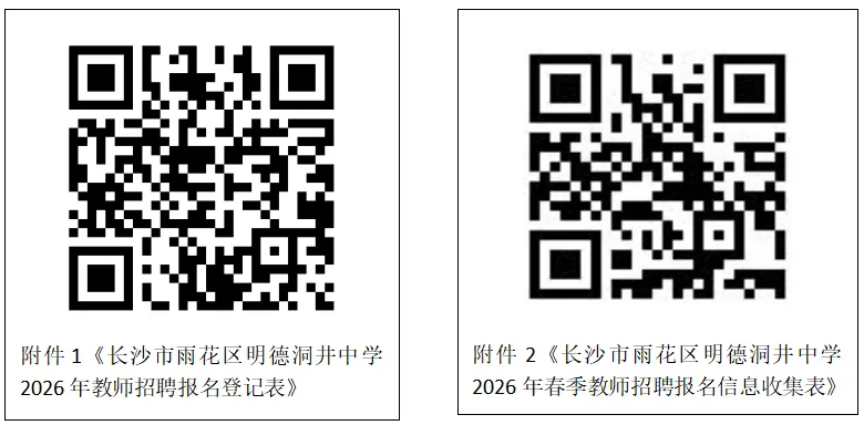 1.报名。报名时间:2026年02月26日至2026年02月28日,报名方式:电子邮箱报名。报名时应聘者必须同时填写《长沙市雨花区明德洞井中学2026年教师招聘报名登记表》(见附件1)和《长沙市雨花区明德洞井中学2026年春季教师招聘报名信息收集表》(见附件2),并将附件1报名登记表(登记表以“应届/在职/骨干-学科-姓名”命名,如应届语文王英)发送到邮箱364867537@qq.com。