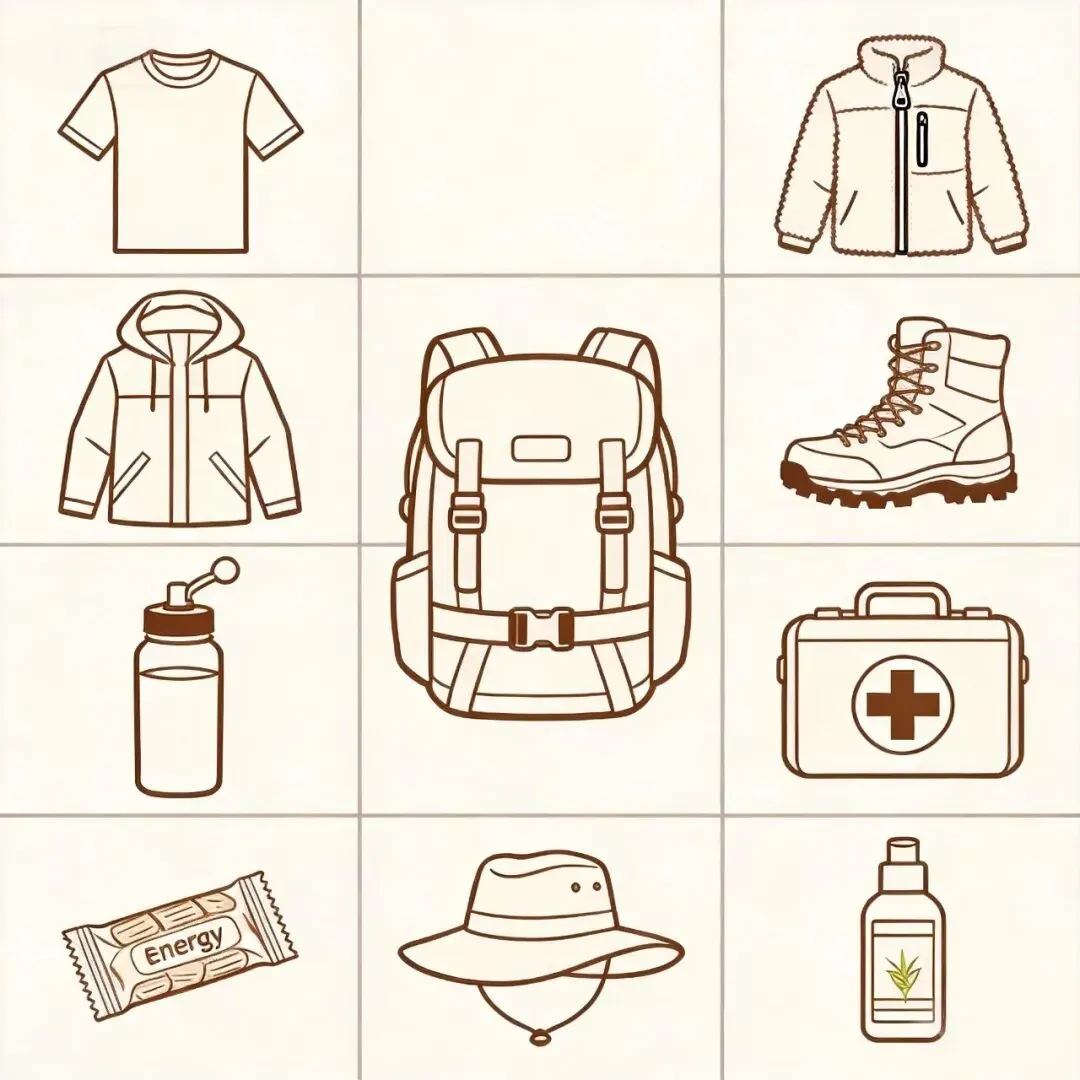 ✅安全:登山杖(双杖省力30%)、急救包、防晒霜、驱蚊液✅亲子:儿童护具、放大镜(自然观察)、保暖毯、对讲机