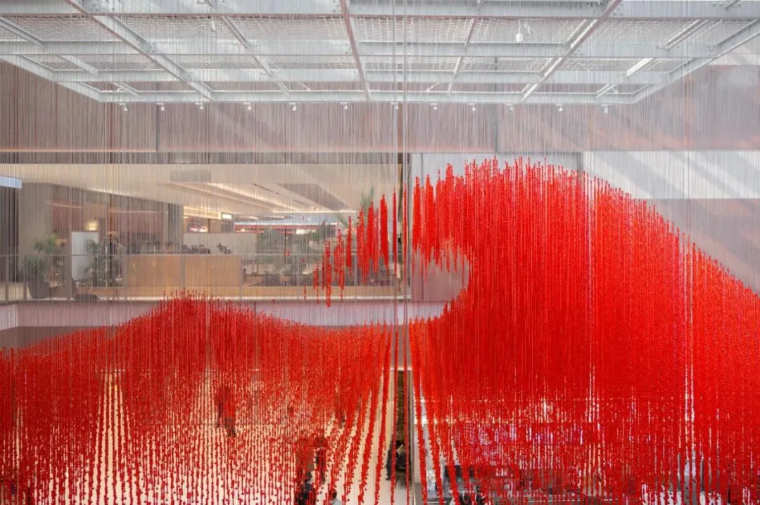 长沙万象城的公共艺术项目“群星来信”,用数十万颗水晶珠串成红色浪潮《潮头》,是“商业+艺术+城市精神”的融合;