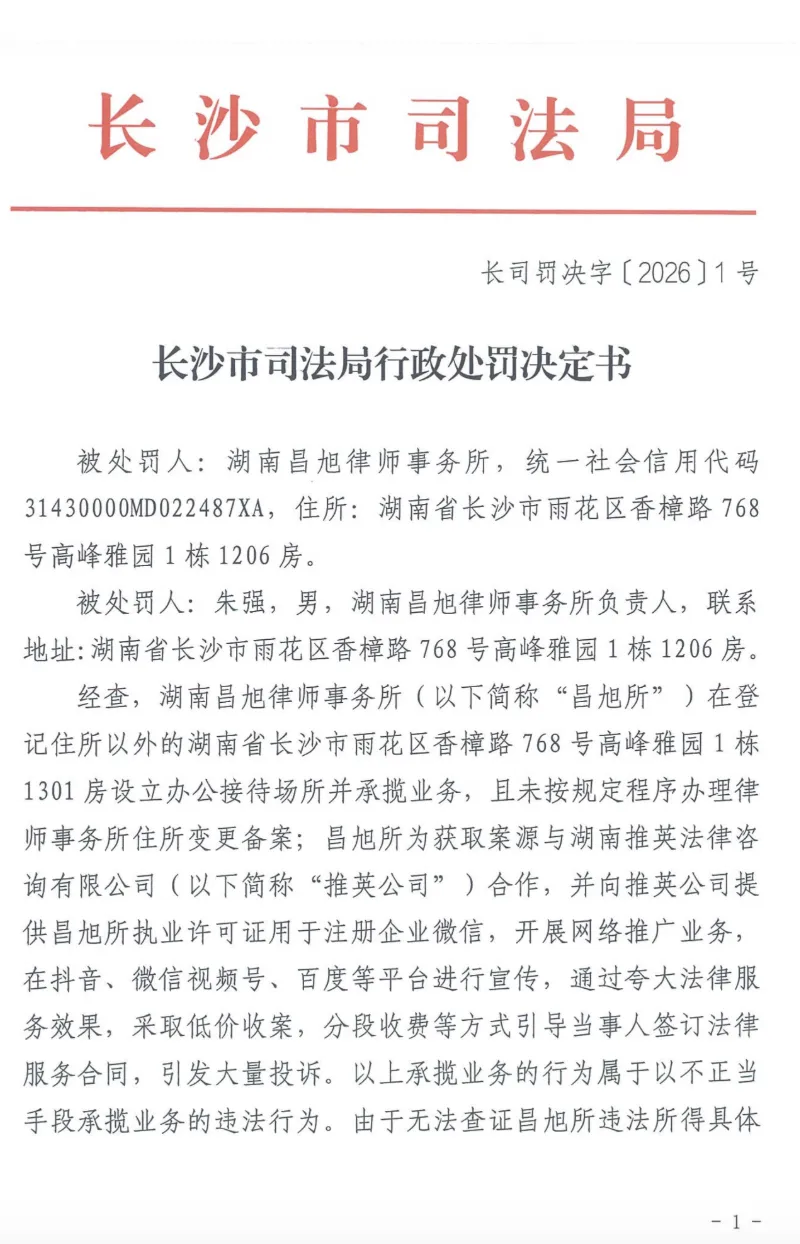 导读:2026年2月10日,长沙司法局发布长司罚决字〔2026)1号行改处罚书。对湖南某旭律师事务所,给予停业整顿6个月,律所负责人警告处分。