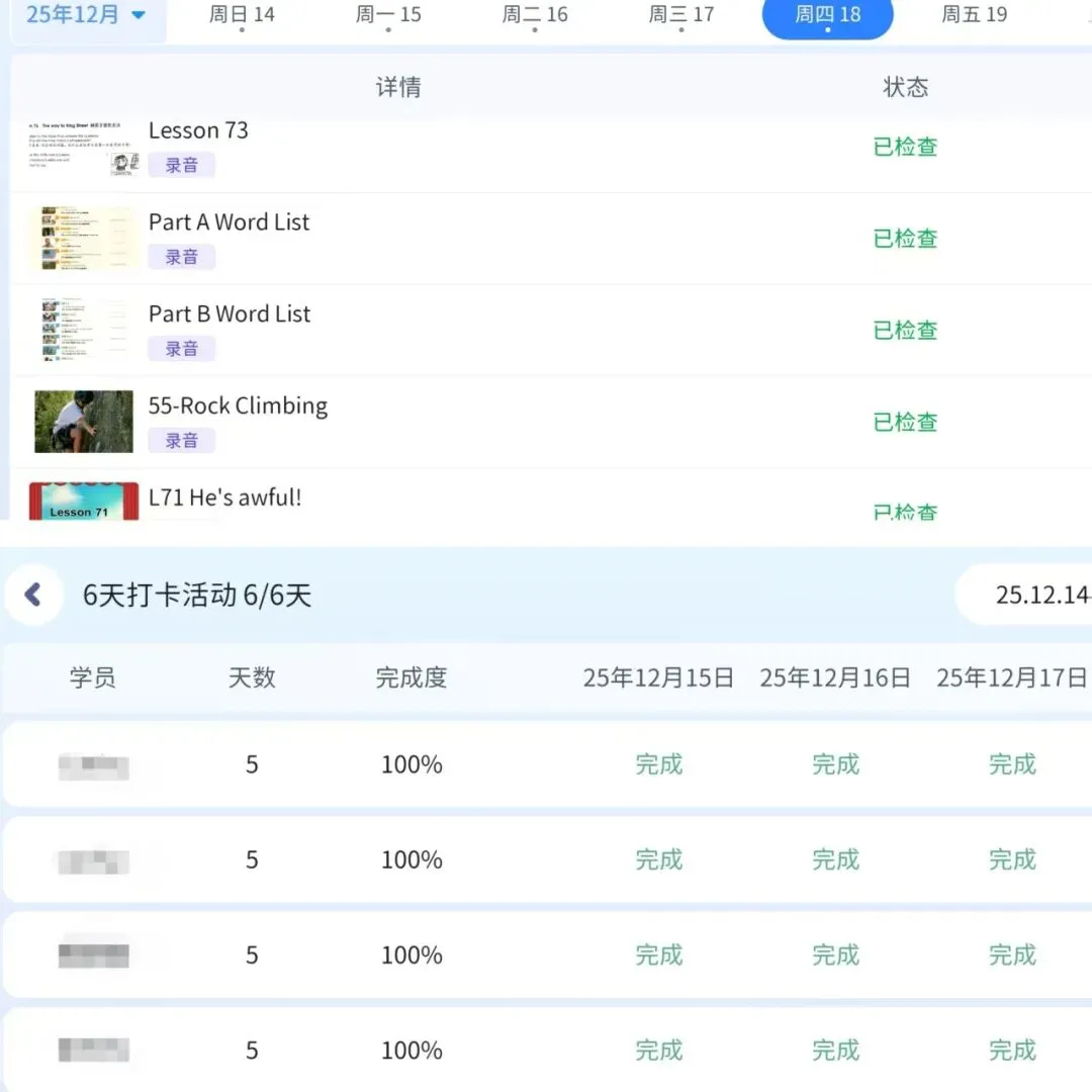 这是我们班级的朗读打卡任务,我会根据孩子们的学习内容,学习基础,安排朗读的任务,每周会记录孩子的朗读情况。