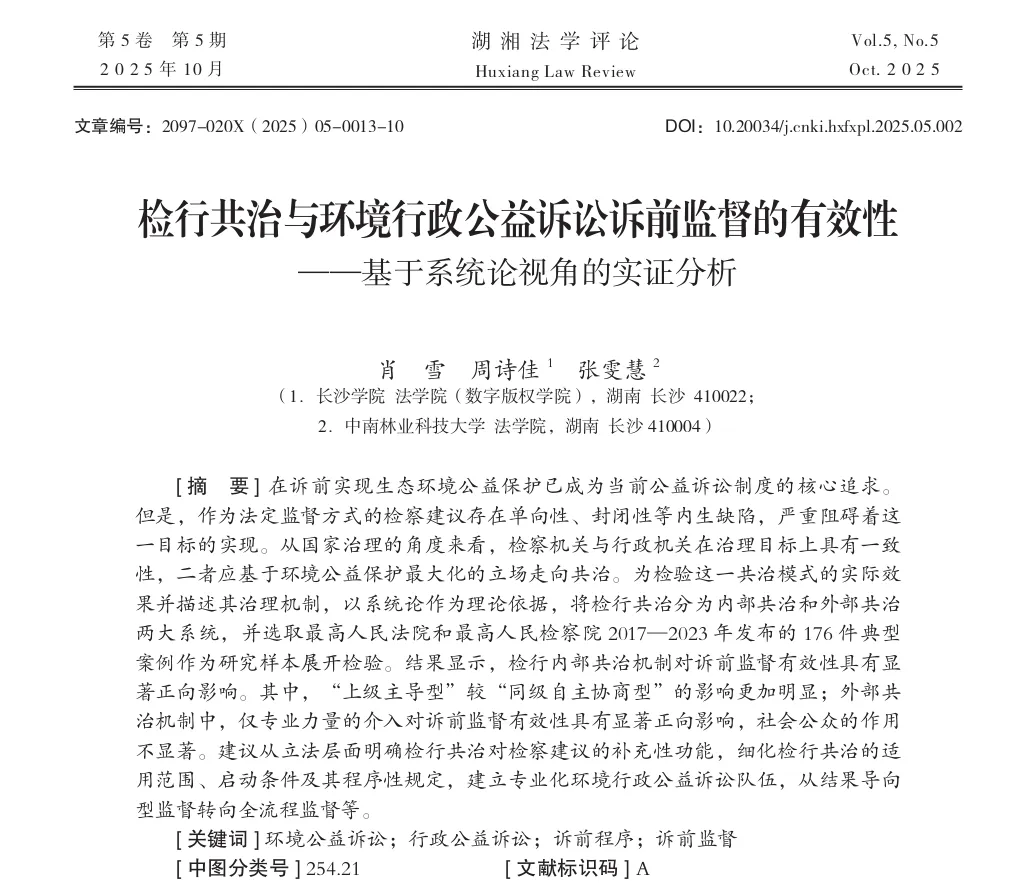 近日,长沙学院法学院(数字版权学院)讲师、法学博士肖雪,长沙学院法学院(数字版权学院)2023级本科生周诗佳,中南林业科技大学法学院讲师、法学博士张雯慧合作的论文《检行共治与环境行政公益诉讼诉前监督的有效性——基于系统论视角的实证分析》在《湖湘法学评论》2025年第5期发表。
