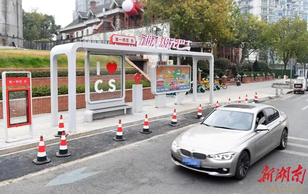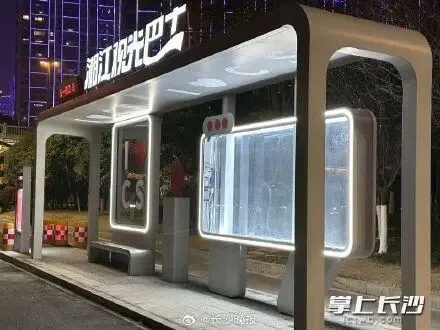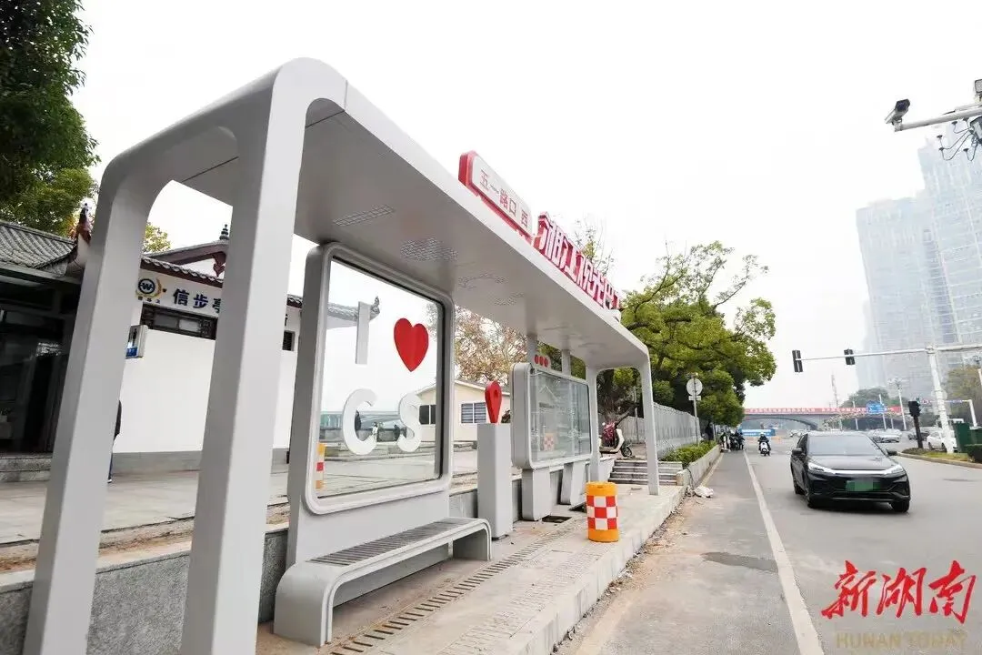 与其他公交车站不一样的是,湘江观光巴士站是红白相间的简约配色、新颖时尚的打卡图标、明亮的白炽灯,共同构成了湘江观光巴士的候车亭。
