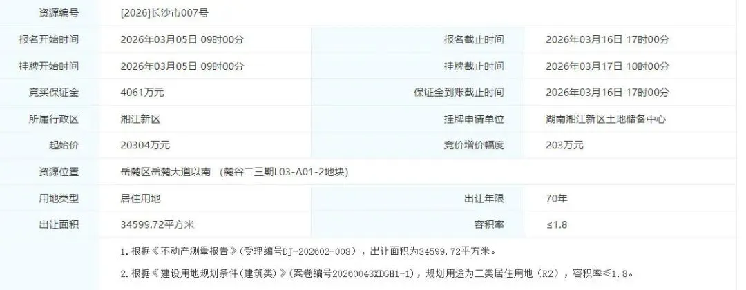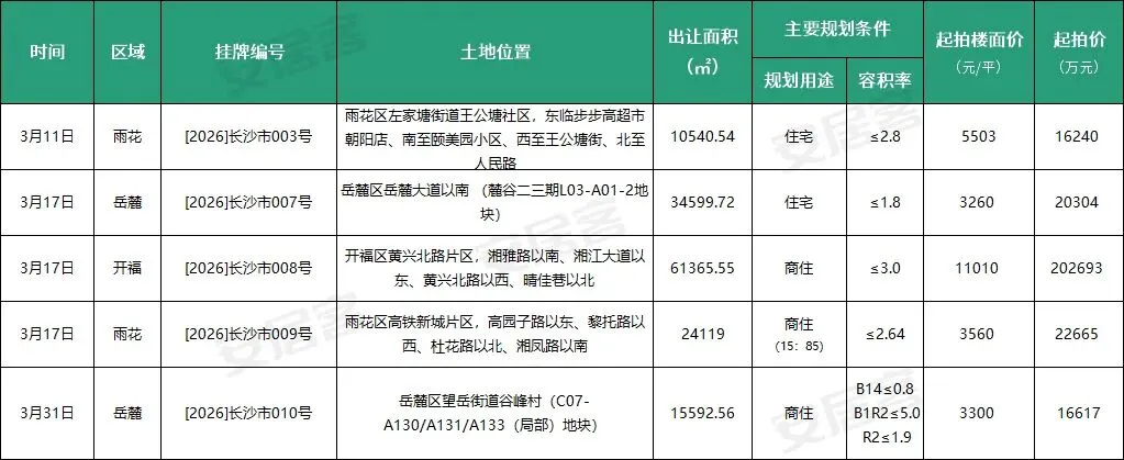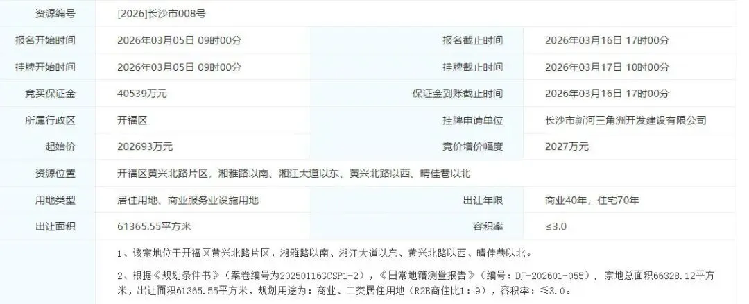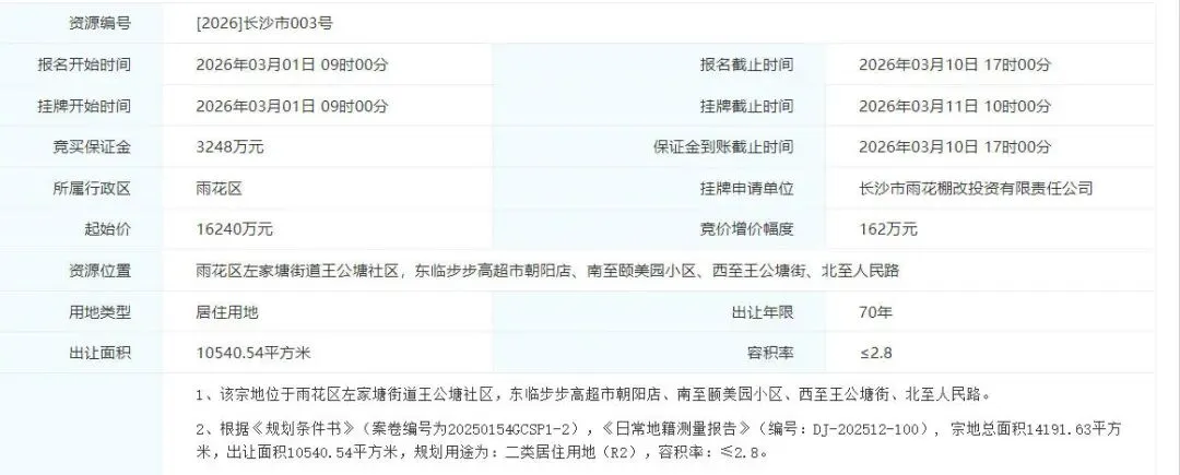 作为3月首宗出让的地块,【2026】长沙市003号将于3月11日率先登场。