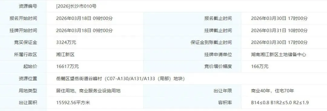 最后一宗【2026】长沙市010号,将于3月31日压轴出让。