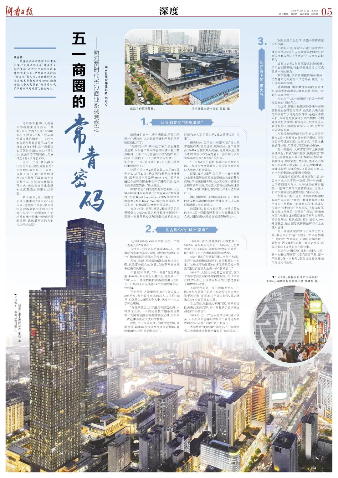 马年春节假期,天南海北的游客走进长沙五一商圈,在巨大的“长沙”LOGO前打卡拍照,在坡子街品尝鲜香火辣的湘菜……长沙市商务局监测数据显示,2月15日至23日17时,五一商圈核心区累计客流达456.97万人次,比去年春节期间的1月28日至2月4日增长15%。2月22日晚,春节假期,长沙市五一商圈人流如织、消费活跃。湖南日报全媒体记者 李健 摄以五一大道与蔡锷南路交会的十字路口为中心,方圆约3公里范围就是五一商圈,这是长沙“心跳”最快的地方。这里聚集了超20家大型购物中心,日均客流量超50万人次,商业密度堪比全球知名度最高的商圈东京新宿。数十年来,五一商圈是长沙人眼中的“城中心”;近年来,这里换代升级,成为是国内外游客慕名而来的“打卡地”。长沙五一商圈如何在新消费浪潮中绘出一幅幅消费新图景,让远道而来的人们为之怦然心动?清晨8时,五一广场还没醒透。茶颜悦色五一广场店内,大店长黄梦娴和早班的同事们已经忙开了。“卷帘门一开,第一批订单几乎会踩着点进来,今年春节期间简直搞手脚不赢。”黄梦娴说。上午10时,前台打印机“滋滋”响了起来,吐出的上一张订单纸还没扯断,下一张又接了上来。半分钟不到,长长的订单纸已垂到柜台下。相距不过百米,就是高耸入云的IFS国金中心。2月23日,杨文亮和妻子从株洲赶来,直奔三楼户外品牌Mont·bell,“老早知道这个品牌在国金中心开了湖南首店,过来为徒步添置装备。”杨文亮说。冲着“首店”来的消费者不在少数。大三学生陈梓妍与同学做了“首店Walk”路线规划:先到Rest&Recreation、KEEN等服饰品牌购物,再去Black Tree喝杯熔岩泰奶,然后来上一口地道的云南野生菌火锅。首店、首发、首展、首秀,形成强劲的消费吸引力。长沙的首店密度稳居全国前十,而五一商圈等核心区域凭借其成熟的商业环境和庞大的消费人群,首店品牌尤其“扎堆”。傍晚时分,位于五一商圈“C位”的大笑脱口秀,座无虚席。剧场后台,脱口秀演员HAHA正在做最后准备。他的观众里,有下班的白领,有约会的情侣,也有专门从外省坐高铁过来“追专场”的粉丝。“一年365天不间断,每晚七点半准时开演,工作日也常常是满座。”长沙大笑喜剧脱口秀负责人许金蓉说。话剧、魔术、相声、脱口秀……五一商圈20余家小剧场如同毛细血管般生长在街巷与商场,年均演出超千场。长沙天心区小剧场协会理事长李佳说,天心区大部分的剧场选址五一广场,节假日期间,游客观众占比可达八成以上。湘江两岸的灯光如流动星河,五一商圈的夜是极具湖湘特色的“热辣滚烫”,让人既能填满胃,也能放松心。数据显示,长沙夜间消费占全天消费额达到60%,五一商圈高峰期日均人流量超百万人次,是国内最火热的夜间消费场所之一。1月2日,游客在长沙市五一商圈太平街打卡游玩。湖南日报全媒体记者 童臻熙 摄长沙城名历经3000年未变,而五一广场一直是长沙“城中心”。1977年,长沙火车站建成通车,五一大道成为连接火车站与湘江岸线的大动脉,五一广场由此跃升为城市的交通中心。人流、物流、资金流如潮水般向这里汇聚。这股蓄势已久的能量,在改革开放浪潮中迎来首次爆发。20世纪80年代,“五一商圈”首度被提出。1990年,中山商业大厦开业,这是第一个“闯”入五一商圈的现代化高层商厦。此前,五一广场街头多是亮着15瓦灯泡的绸布庄、针线铺。开业当天,人流量达到30万,营业收入270万元。当年长沙市区的总人口仅约132万,也就是说,每四五个人中,就有一个人去了开业现场。“站在商厦里,才知道光可以这么亮,人可以这么多,一个商场能装下整条街的繁华。”友阿集团副总裁崔向东还记得,当年第一次逛中山商厦时的震撼。很快,中山商业大厦、东塘百货大楼、晓园百货、韶山路百货以及友谊商店崛起,媒体报道称之为“五虎闹长沙”。1998年,外资背景的平和堂来了。2002年,黄兴路步行街完工。2004年,王府井百货开业。2006年,新世纪百货补上最后一块“拼图”,五一商圈的格局就此成型。长沙“妹陀”刘欣颖回忆,当年平和堂、王府井这些商场里的牌子,好多都是头一回见。“父母在平和堂花800多元给我买过一条连衣裙,那是我人生第一件‘奢侈品’。”2010年,入驻长沙的星巴克首店,创下了当年它在亚洲的单店销售纪录。2017年开业的IFS,则让长沙商业从百货业态过渡到了购物中心时代。茶颜悦色的第一家门店诞生于五一广场,文和友品牌下的第一家老长沙油炸社生发于坡子街;喜茶2019年进入长沙,首店就选在IFS对面的惠农大厦。本土商业力量在此丰满羽翼,外来商业巨头来此正面交锋,五一商圈成了长沙商业演进的“主擂台”。2019年,五一广场从杜甫江阁、橘子洲头、天心公园和岳麓山顶等10个备选地标中脱颖而出,成为长沙的“城市原点”。当消费时代的浪潮拍岸而来,五一商圈也当之无愧地成为最鲜活耀眼的“城市原点”。2月22日晚,春节假期,长沙市五一商圈人流如织。湖南日报全媒体记者 李健 摄上海新天地,保留了石库门弄堂的肌理与外观,内部引入全球前沿的餐饮、时尚与文化品牌,让消费者“在弄堂里逛世界”;成都太古里,创造沉浸式购物场景,千年古刹的禅意与全球潮牌的活力汇成别具一格的魅力;东京银座,以极致细腻的服务著称,消费者来此买到的不仅是商品,更是一份无可挑剔的体验;首尔明洞,堪称韩流风尚的