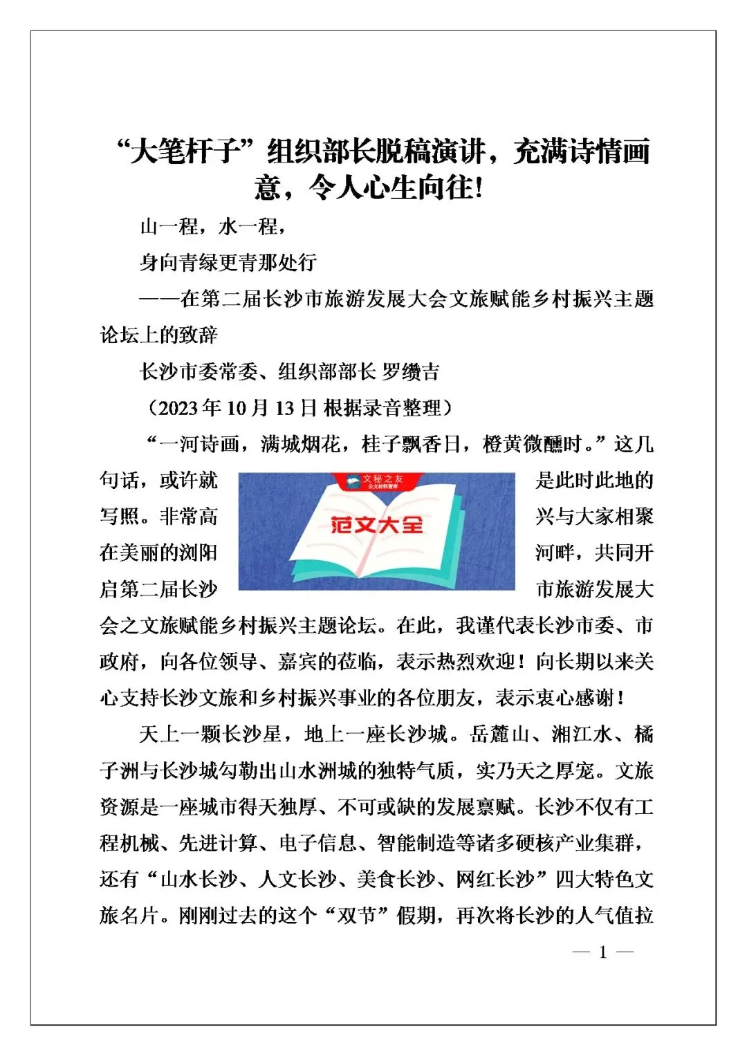 今天这篇《“大笔杆子”组织部长脱稿演讲,充满诗情画意,令人心生向往!》真是让读者读着舒服。开头那句“山一程,水一程,身向青绿青那处行”,一笔把人带进去了,我个人认为不像普通讲话那样干巴巴的,倒像是在吟一首山水诗,把长沙的气质轻轻托了出来。