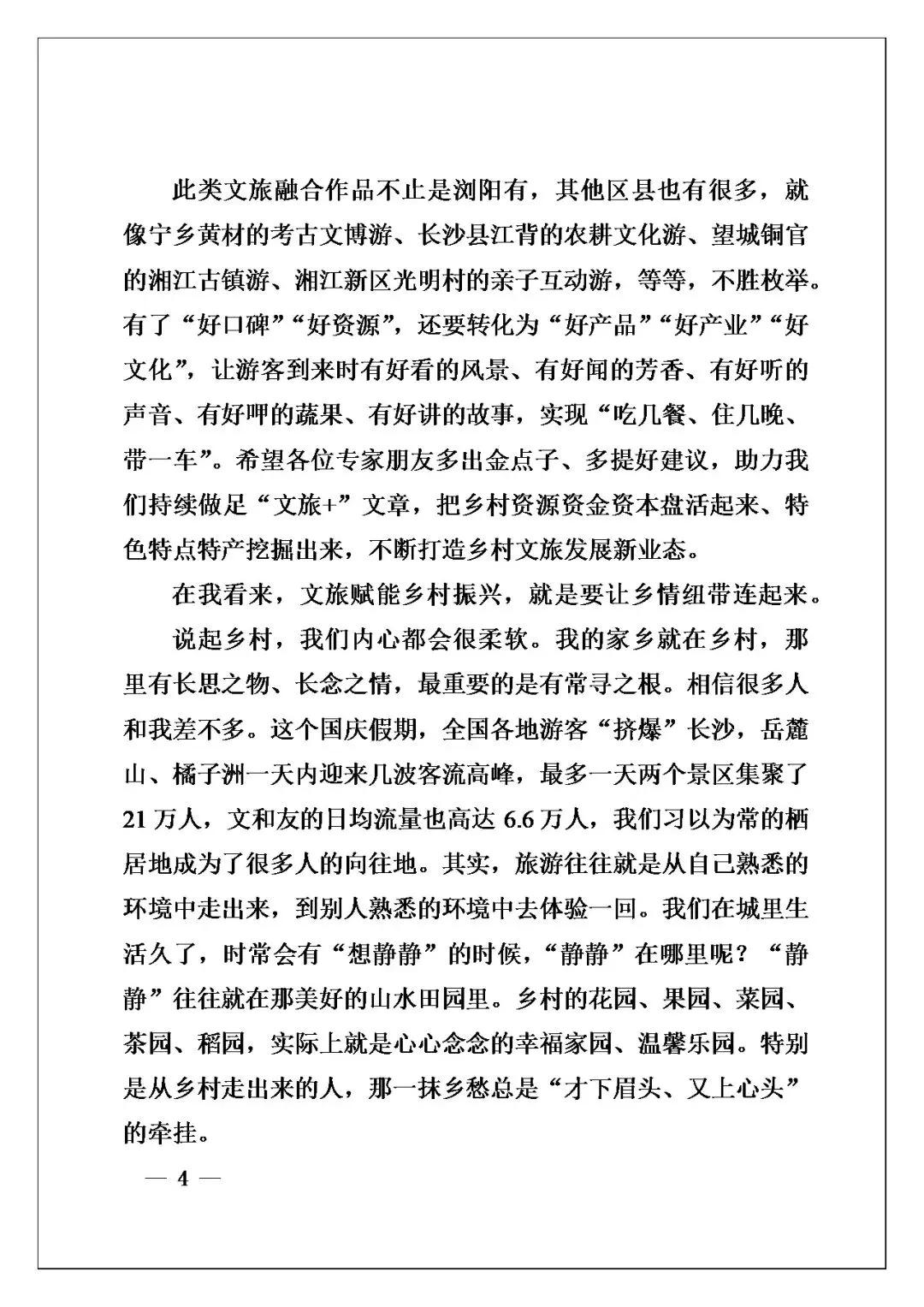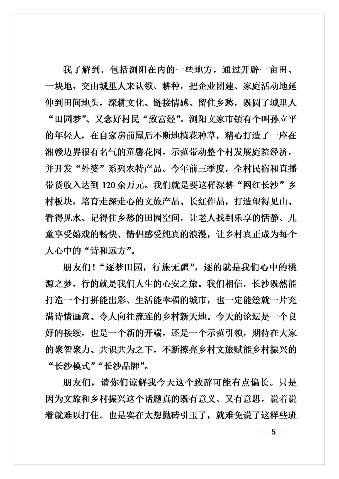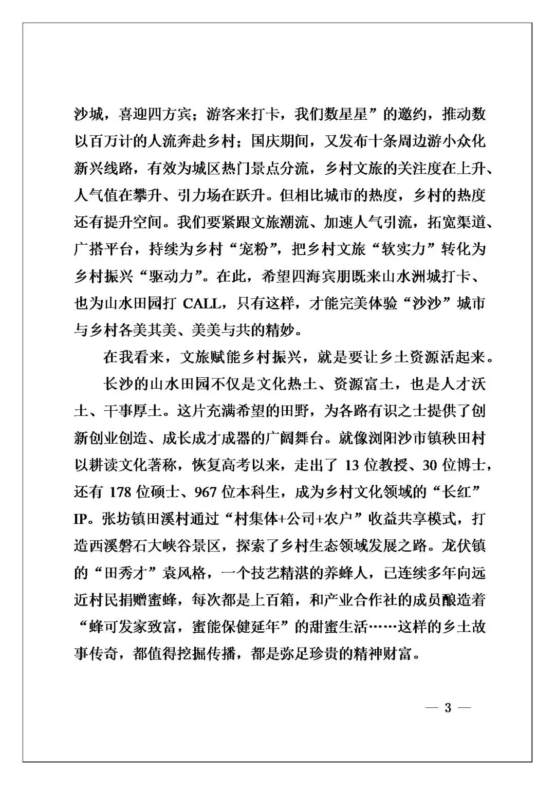 写作角度非常巧妙,不是光说政策或数据,在我看来是情怀出发,讲“乡愁”“田园梦”材料中这些柔软的东西,落到具体案例上,像浏阳的童馨花园、张坊的“蜂可发家致富”,是实打实的例子。诸如此类写法有温暖有厚度,把“文旅赋能乡村振兴”这个大主题讲得生动深刻,难怪能打动到人心。
