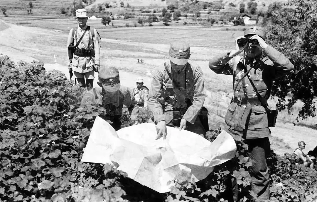 國軍蔣領 通過 地圖和望遠鏡尋找方位勘察地形